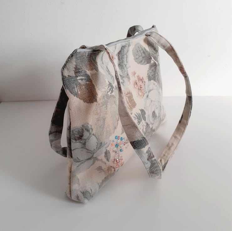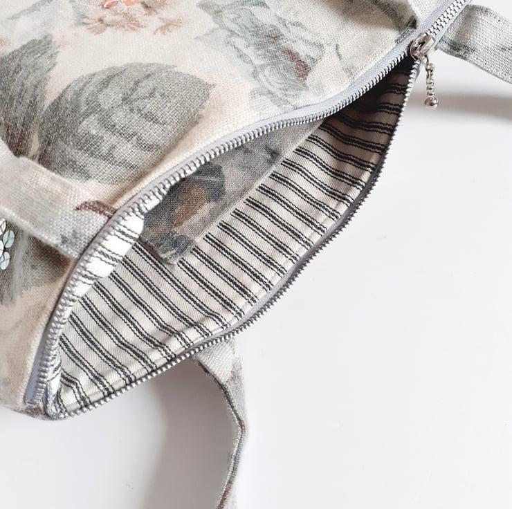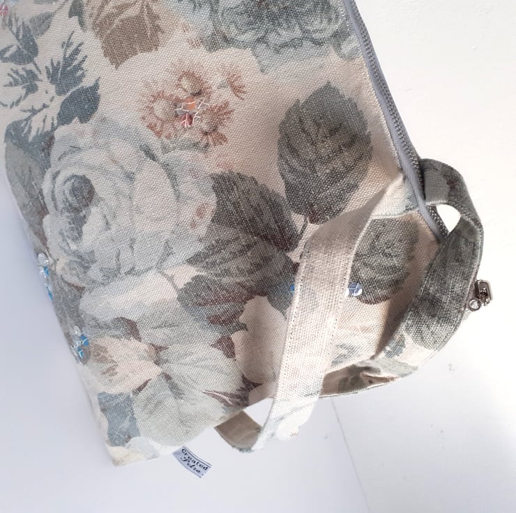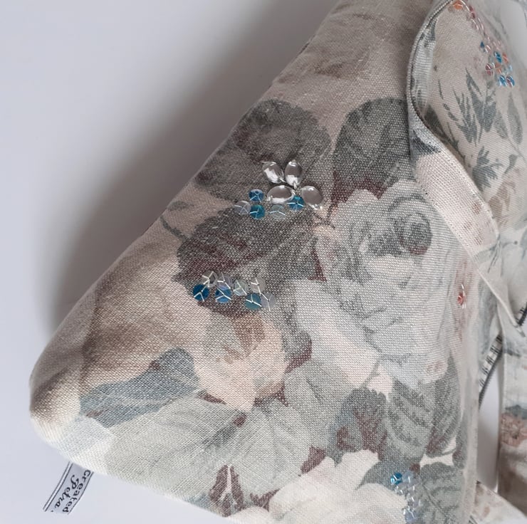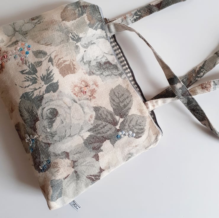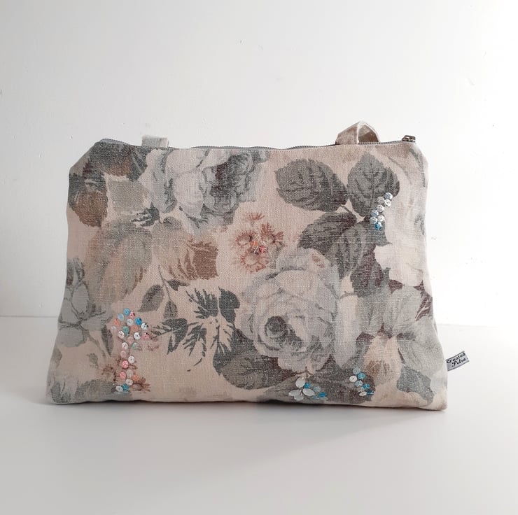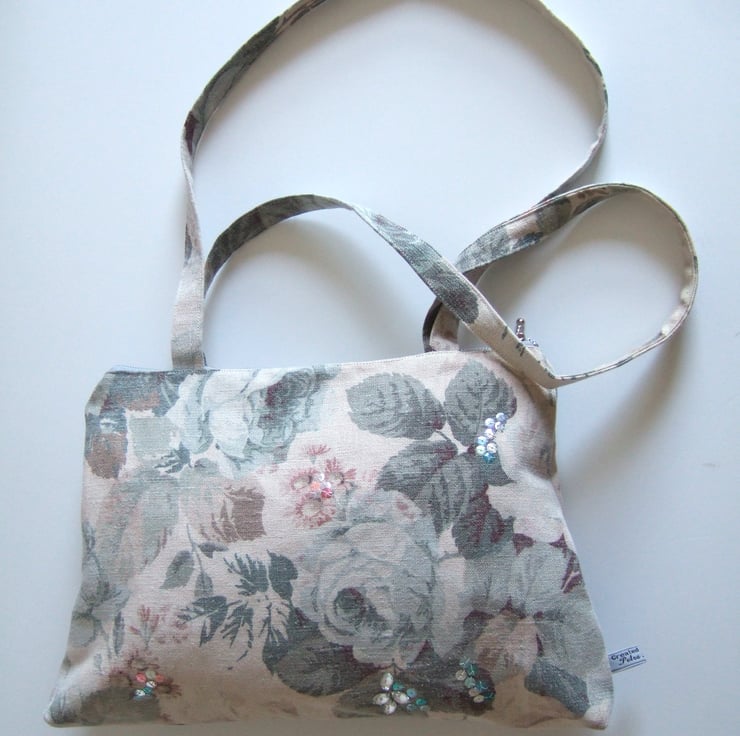 A lovely roomy shoulder bag, made from a washed linen vintage Sanderson fabric. Its full blown grey/blue roses and dusty pink flowers give it a country house charm. This is the last bag in this fabric, and so I am selling it in my Seconds Sunday as an end of line. There are no flaws in it, I just need to make precious room for new stock. If you like softly faded fabrics with a hint of crumpled linen, then this is for you. It would be a great bag for a summer wedding or garden party.
