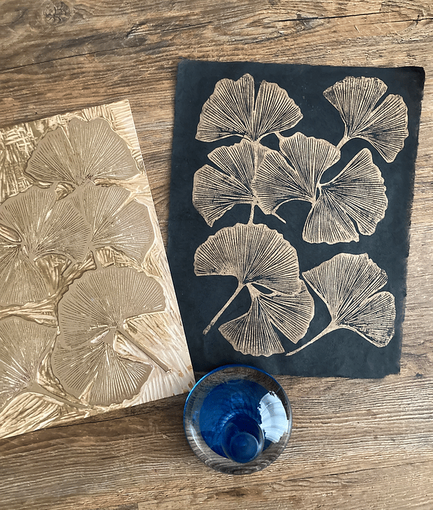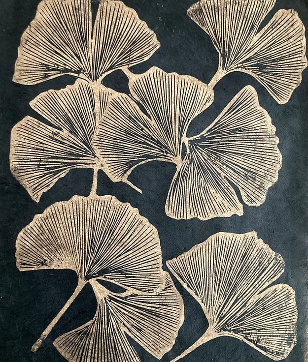This print measures approximately 25 x 35cm and is hand printed with gold, oil based ink and hand burnished using a glass baren onto black, handmade paper. This paper is very fine, tissue like paper and the natural elements enhance it’s look.