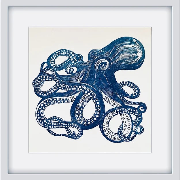 Hand carved and printed onto smooth, off-white, printmaking paper using Cerulean Blue oil based ink.