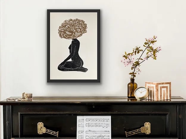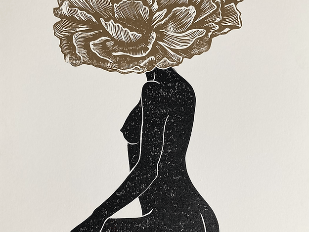 The image depicts a simplified female nude, to celebrate the beauty of the female form in its natural way. The peony flower replacing her head makes the figure appear almost goddess like.