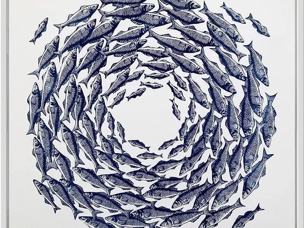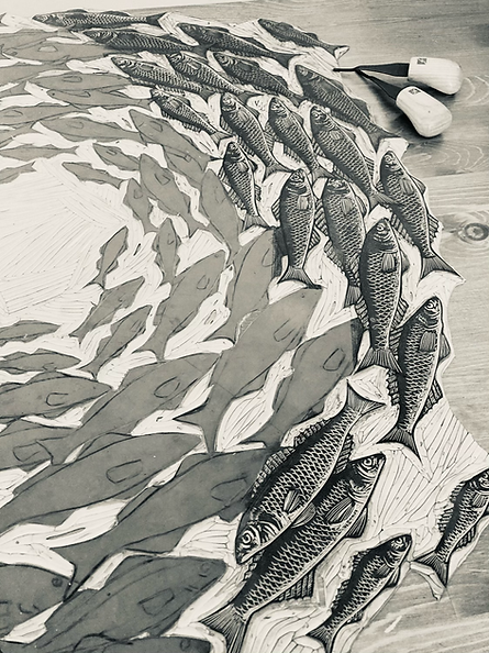 I have drawn my interpretation of a School of Bass fish directly onto the linoleum block and then using fine detail printmaking tools, carved the detail.... many many scales! I have titled this Artwork ‘Go Your Own Way’ and if you look closely you’ll see one of the fish swimming in the opposite direction.