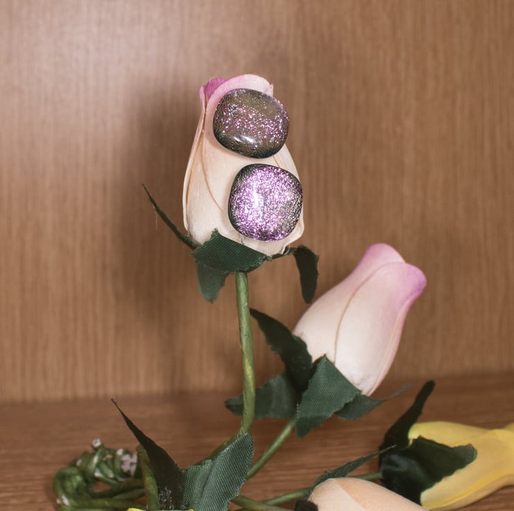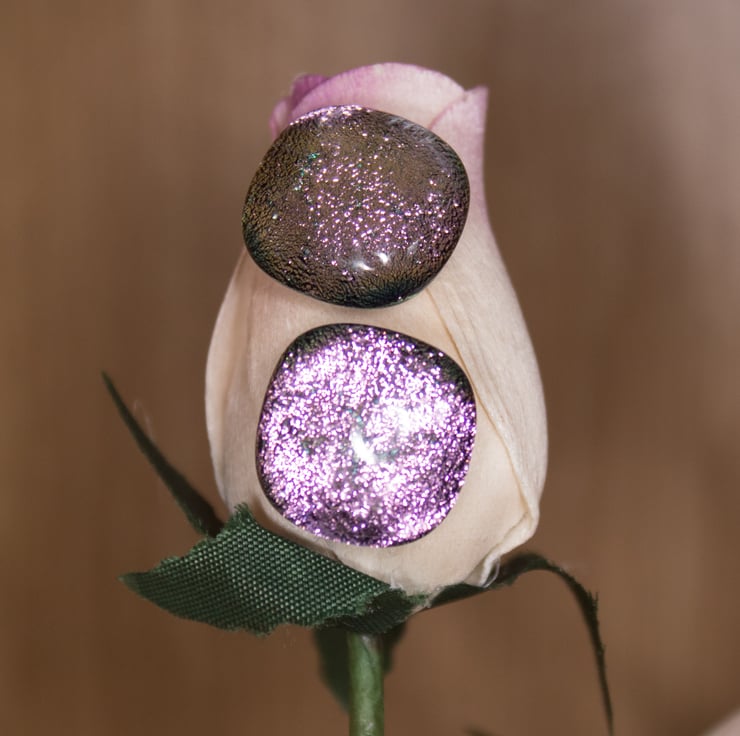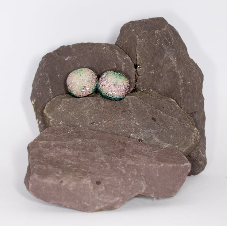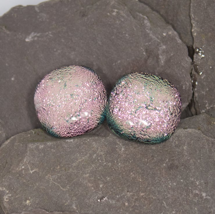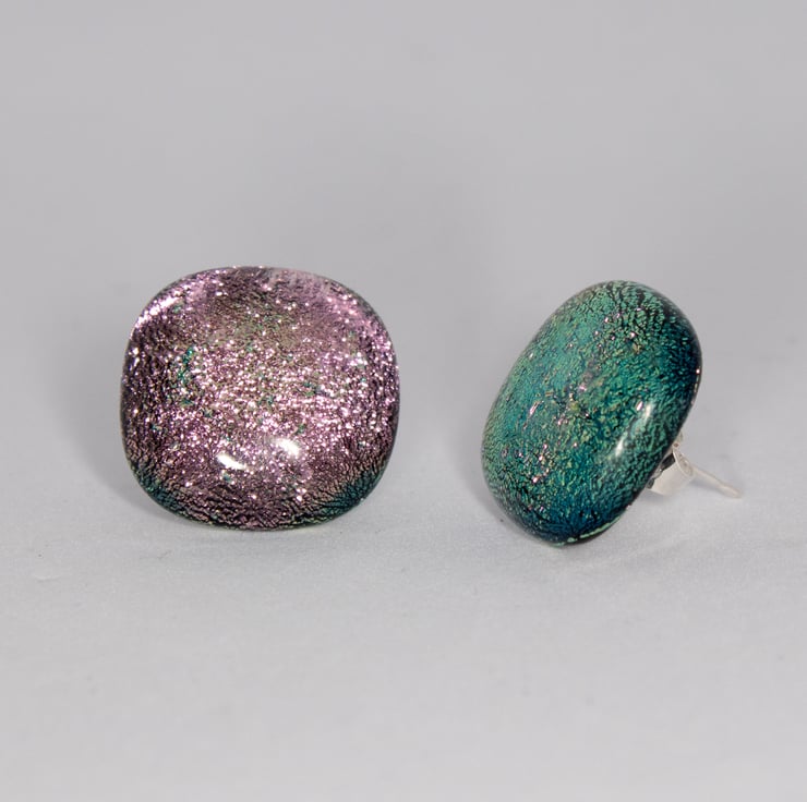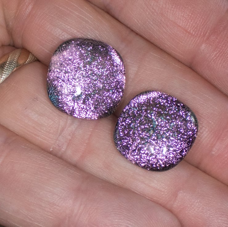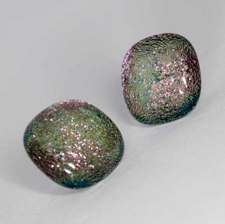 We have a range of earrings created from dichroic glass - we love working with it. The colours that Dichroic Glass show continues to amaze and surprise us. When we open the kiln we are always looking to see what the kiln-fairies have been up to.