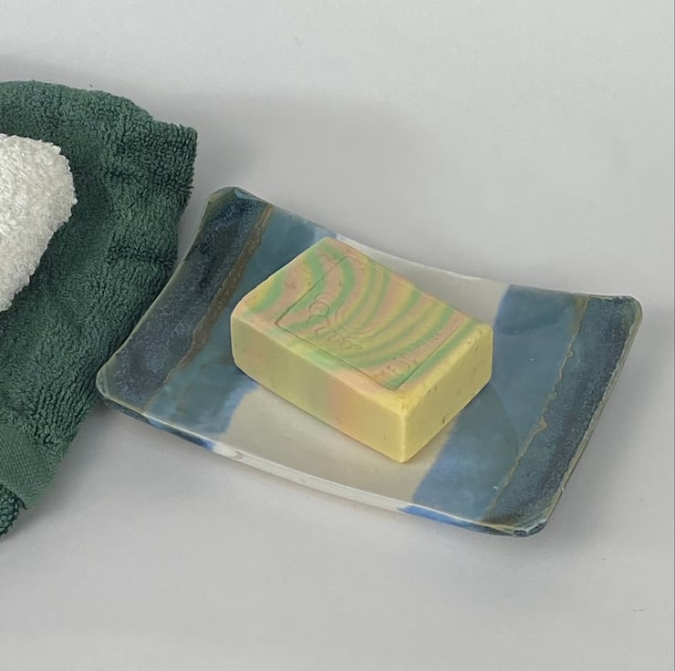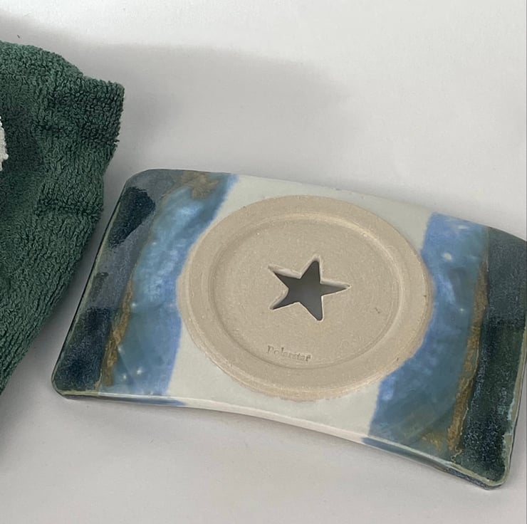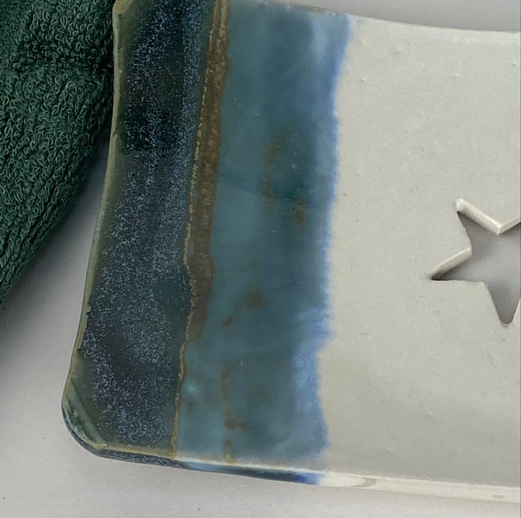 A soap dish that has been thrown on the wheel and then trimmed into a rectangle which has a slight curve. A star cutout allows the soap to drain. Glazed in white with blue-green ends. Turned footring.