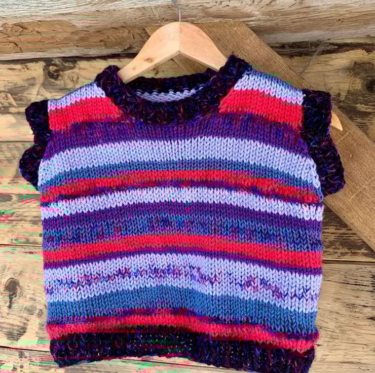 This handmade sleeveless jumper is knitted with a mixture of yarns including mohair and acrylic.
