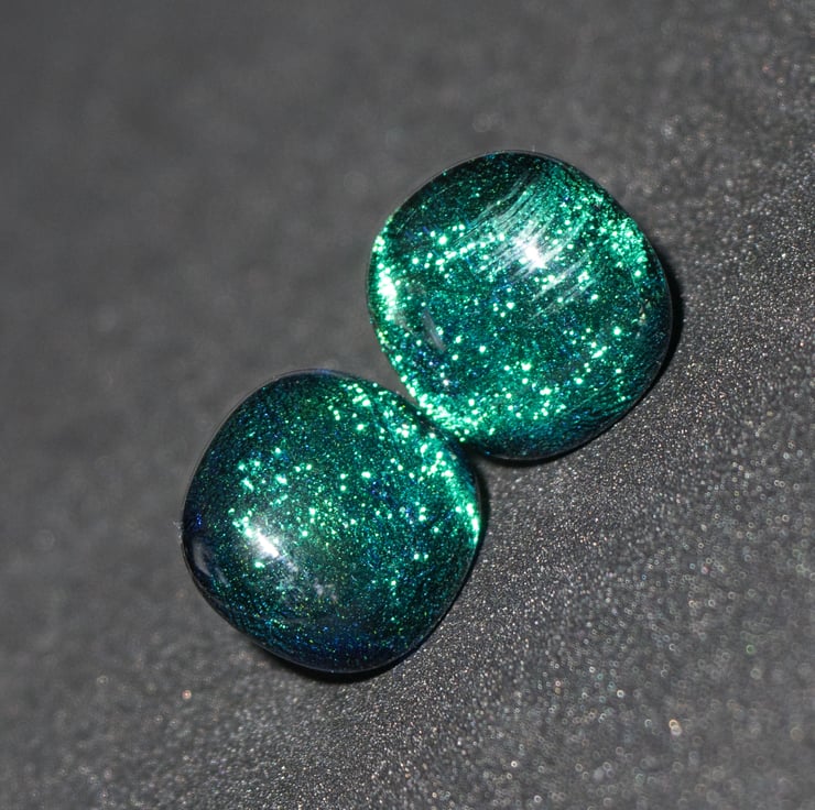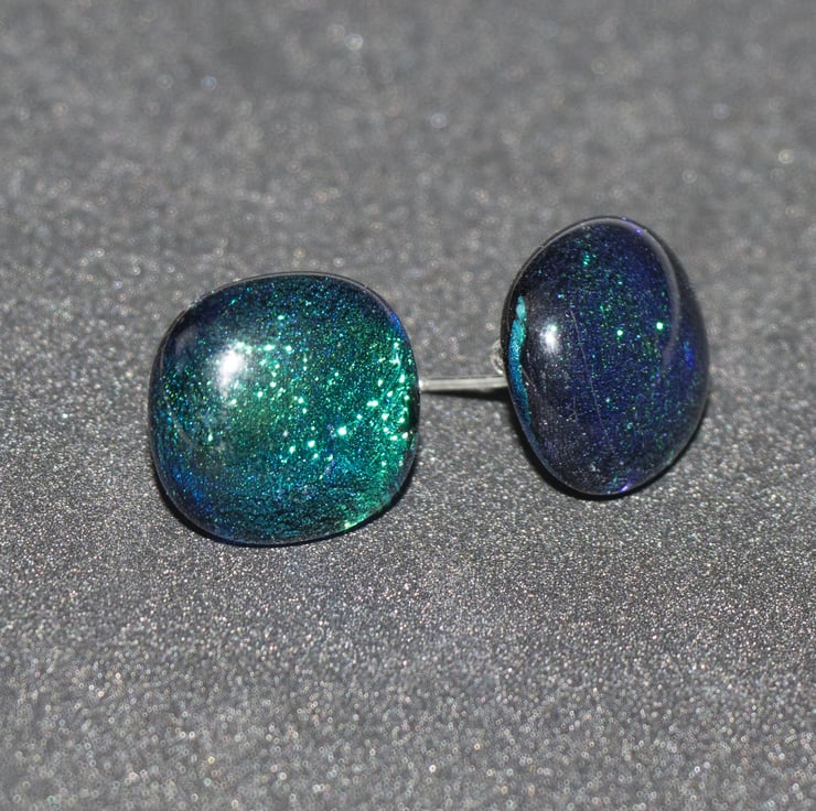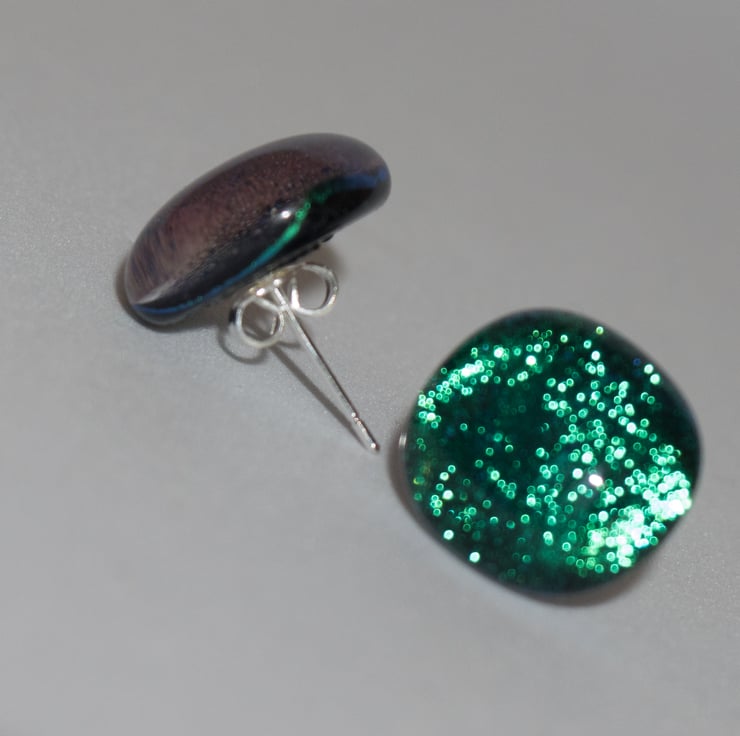 This pair is Emerald Green with a sparkle, but if the light catches them right they can show a lovely royal blue. The studs and butterfly backs are Sterling Silver. They will be shipped in a black presentation box.
