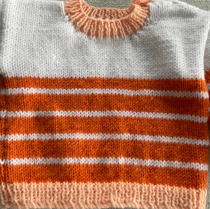 This bright jumper is hand knitted in a soft baby yarn. The ribbed borders and neckline are worked in the peach colour, the yoke is white and the bottom is worked in broad stripes of orange and narrow stripes of white. The jumper fastens on the shoulder with three orange buttons.