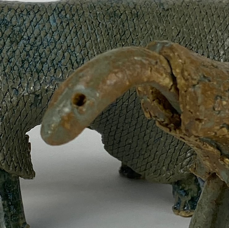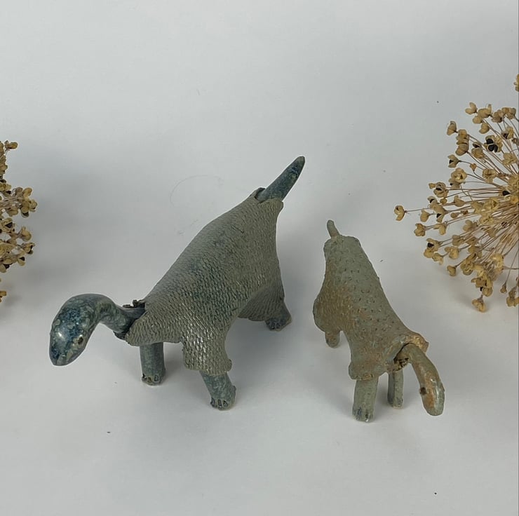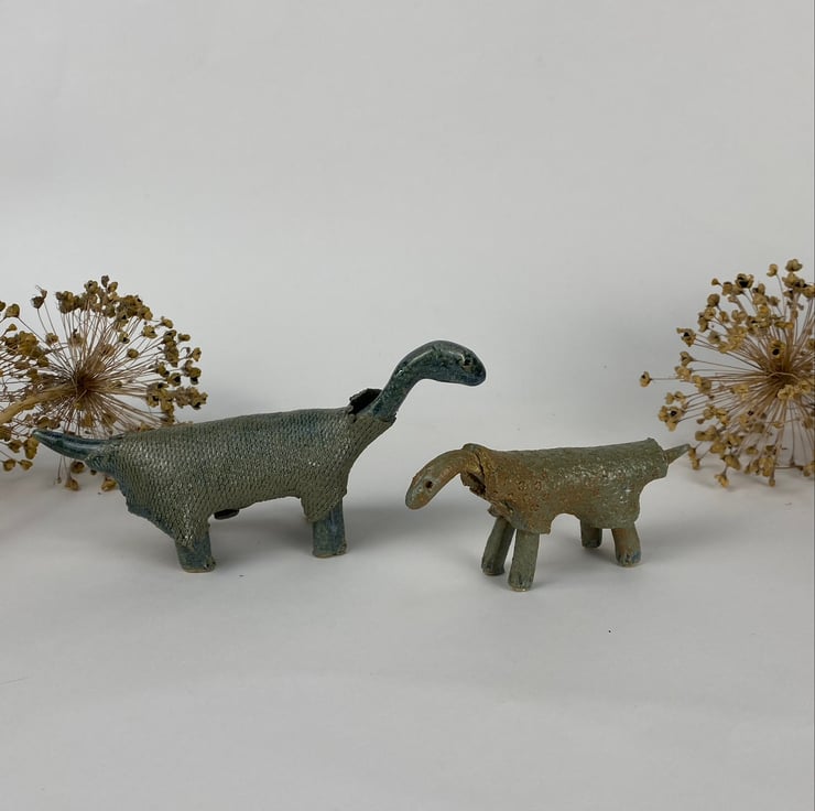 A small pair of handmade dinosaurs, each wearing a textured ragged coat.