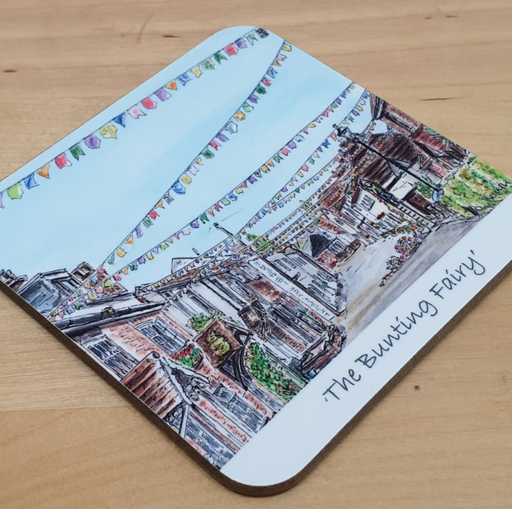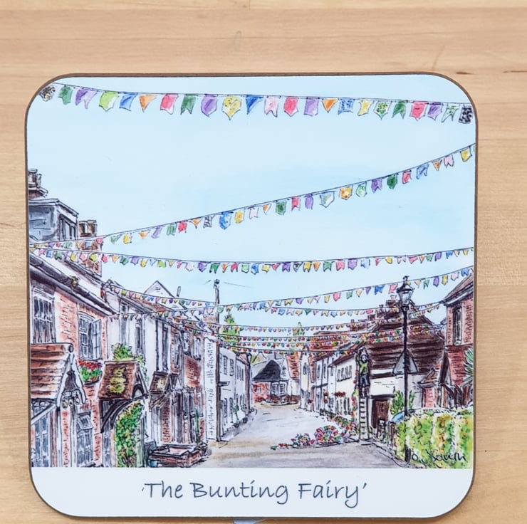 A 90mm square coaster featuring Jo's watercolour painting of The Bunting Fairy
