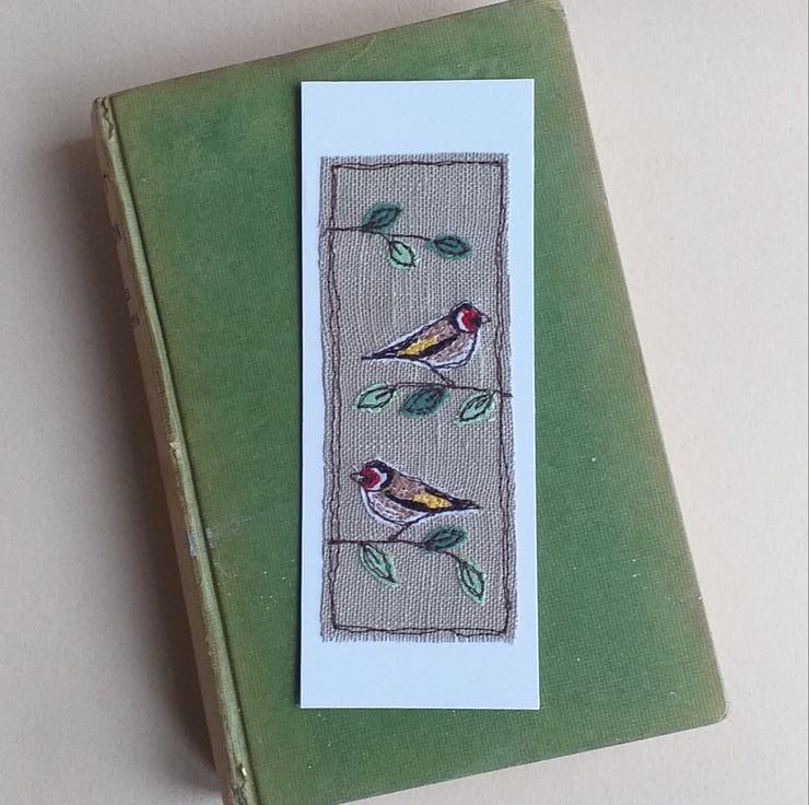 A bookmark made with 300gsm card with a goldfinch design. The birds are sewn onto linen with free motion embroidery, then the linen sewn onto the card.