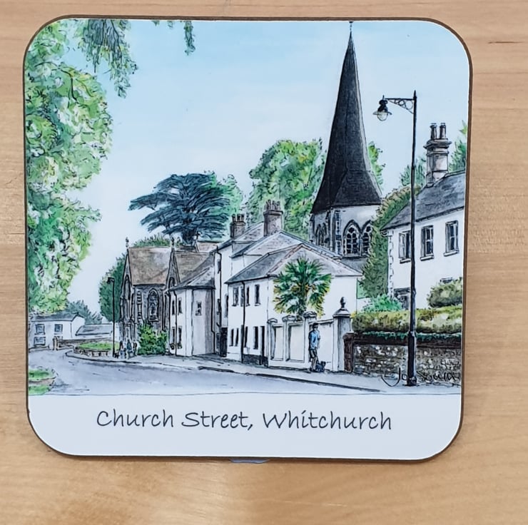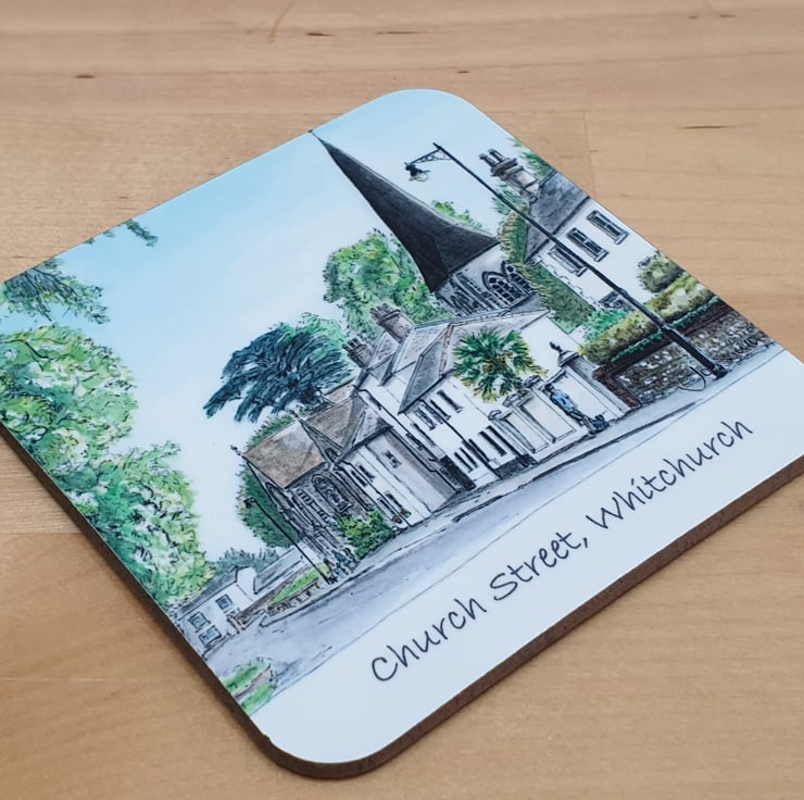 A 90mm square coaster featuring Jo's watercolour painting of Church Street, Whitchurch