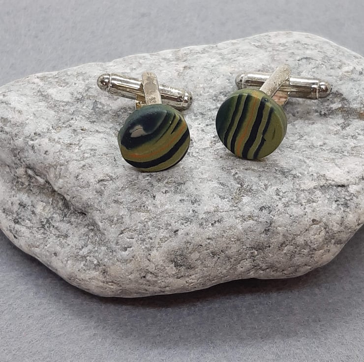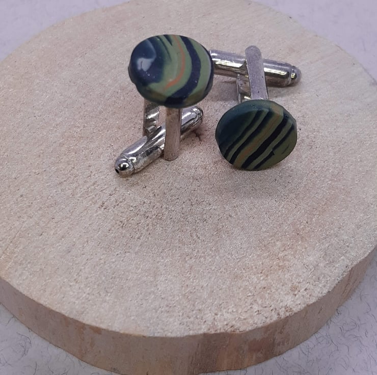 Handmade cufflinks using a mixture of sage, navy and orange polymer clay to create this unique swirl design.