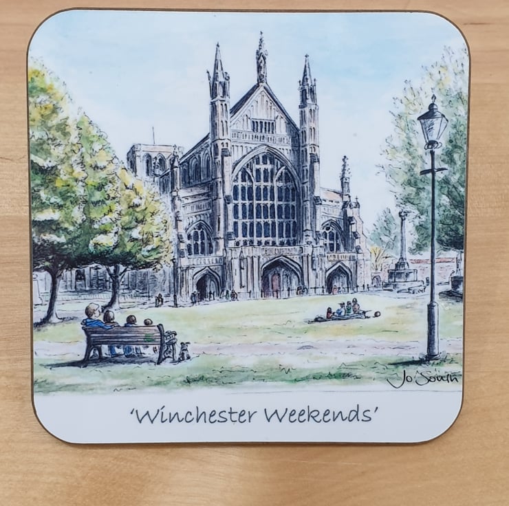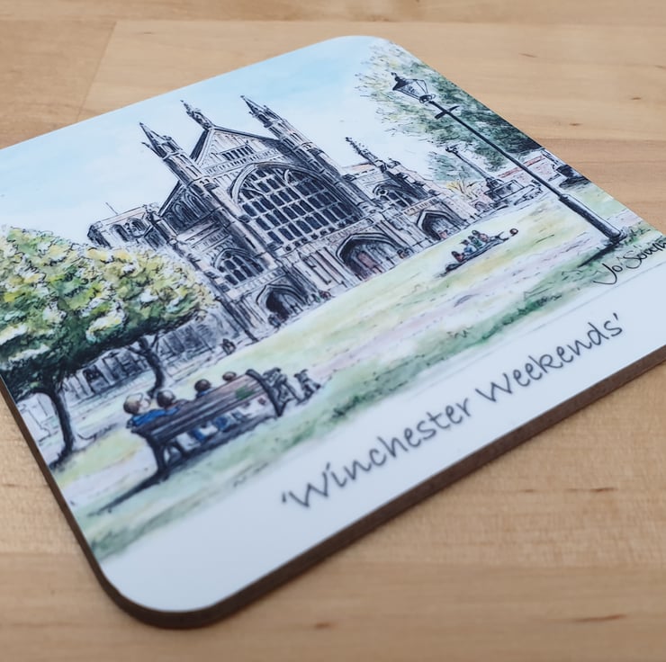 A 90mm square coaster featuring Jo's watercolour painting of Winchester Weekends