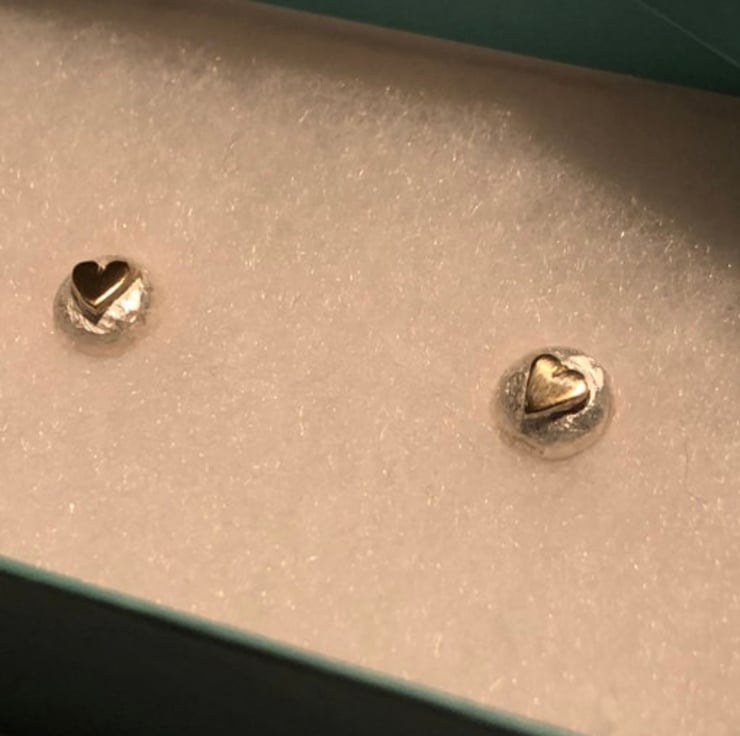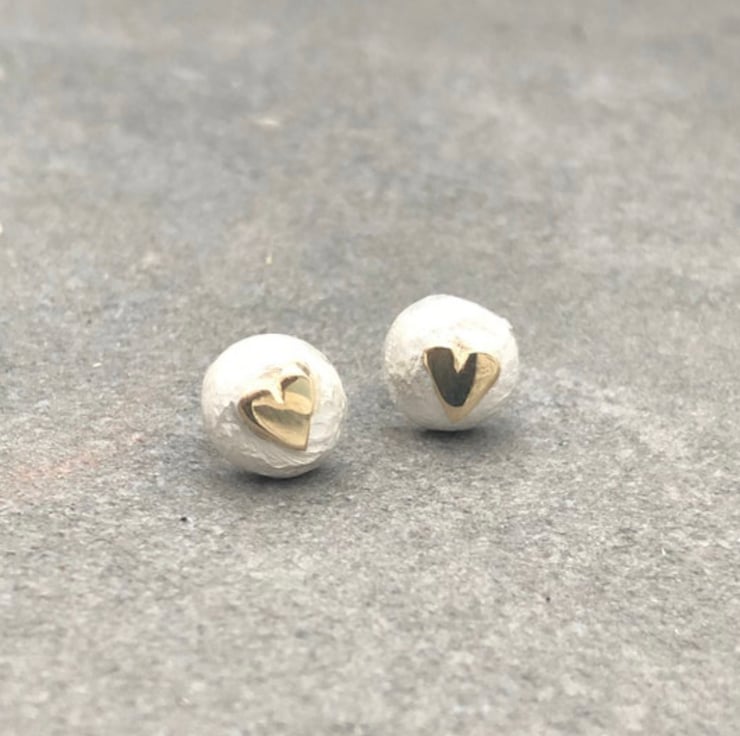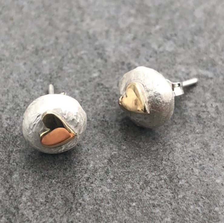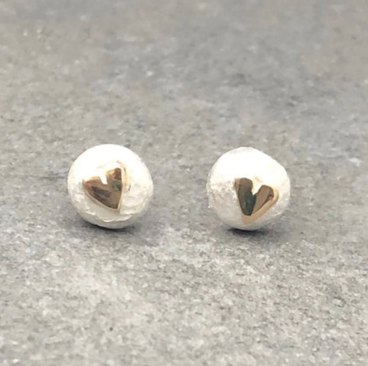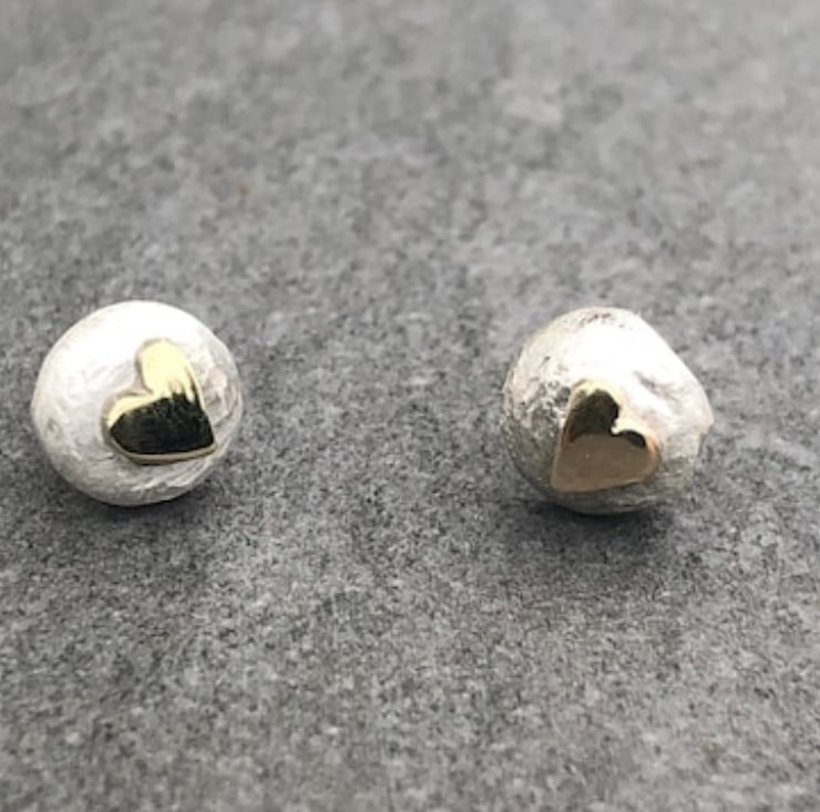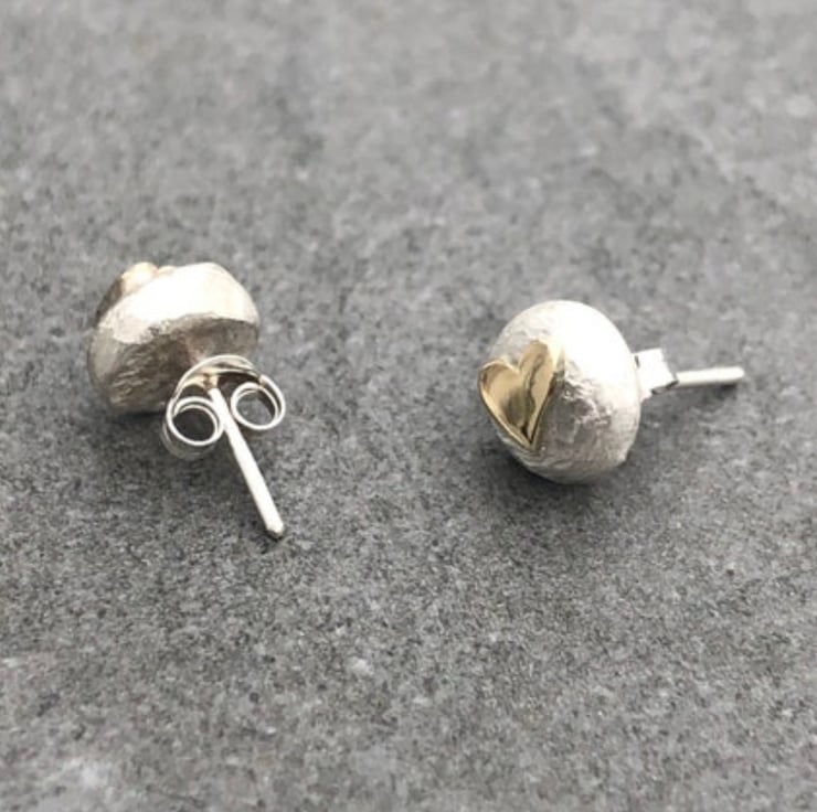 These Sterling Silver pebble studs have high polished, 9ct gold heart detail which contrasts beautifully with the white, matt silver. The studs measure approx: 8.5mm in diameter and also have Sterling Silver posts and butterfly backs.