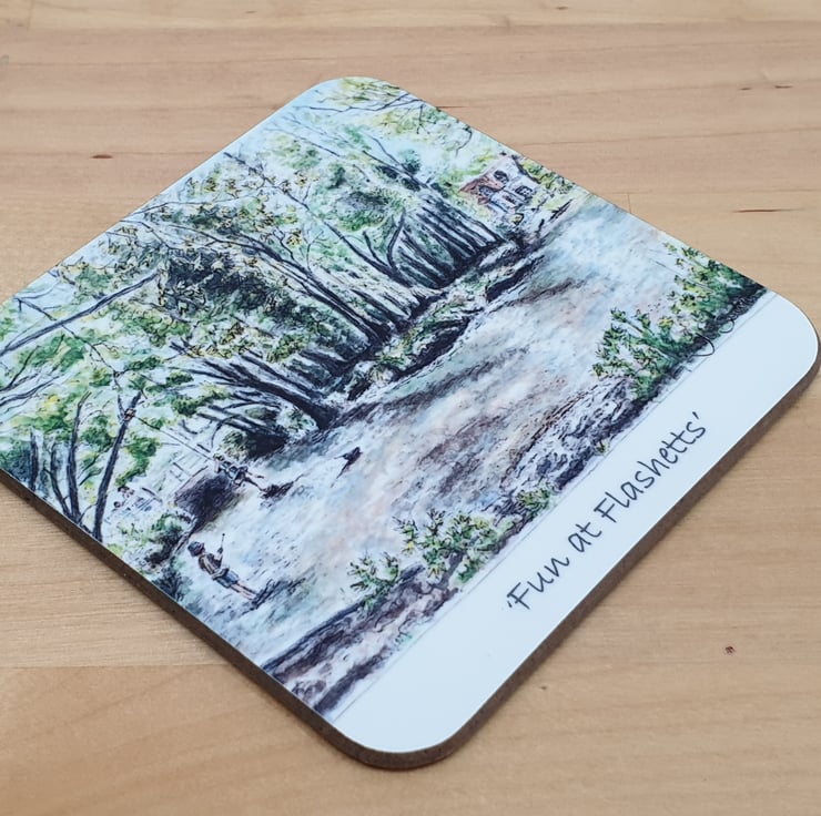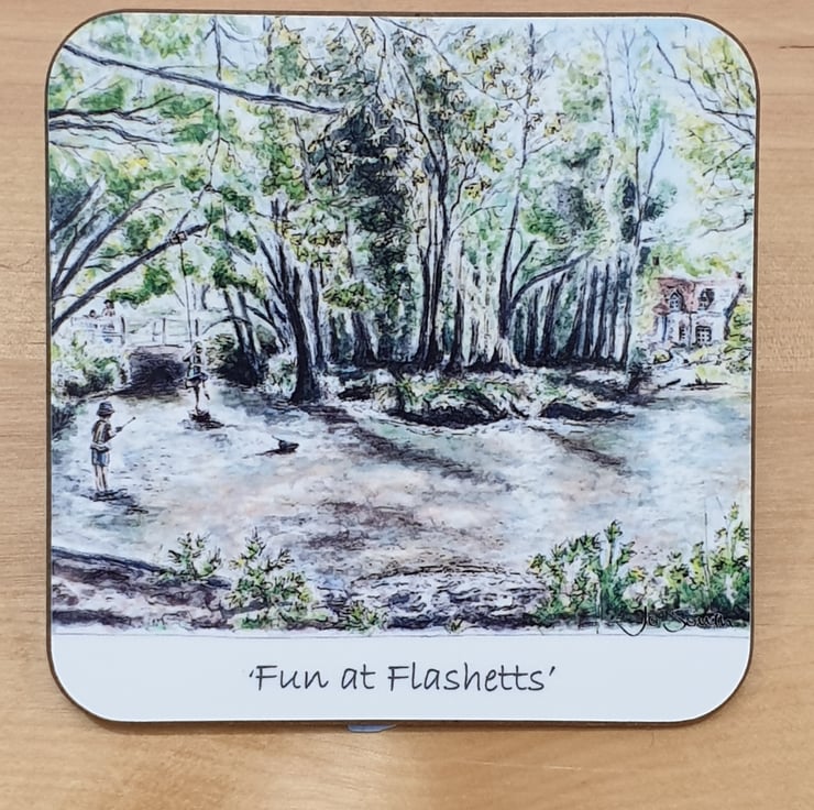 A 90mm square coaster featuring Jo's watercolour painting of Fun at Flashetts, Overton