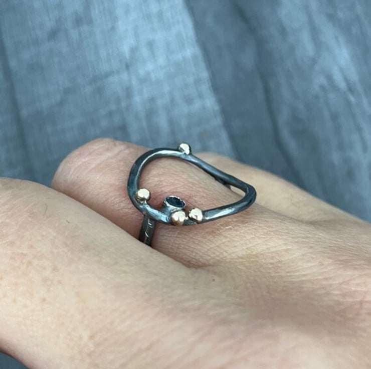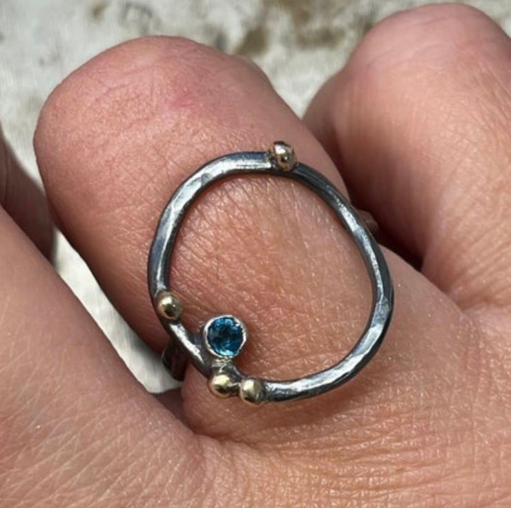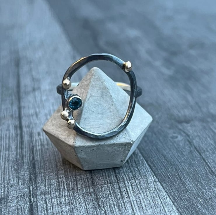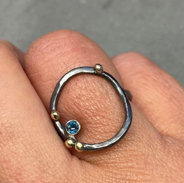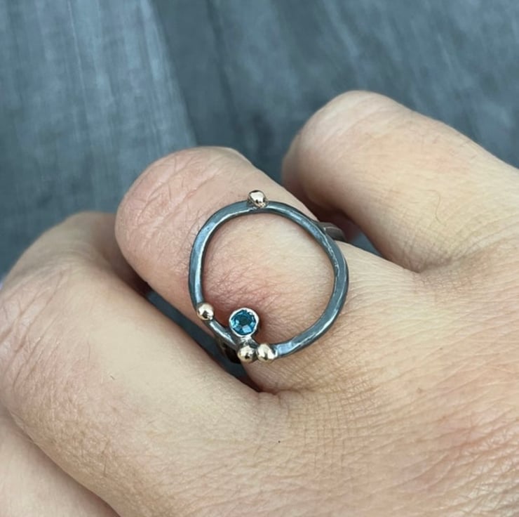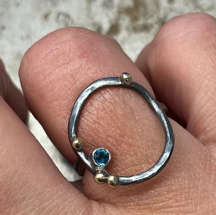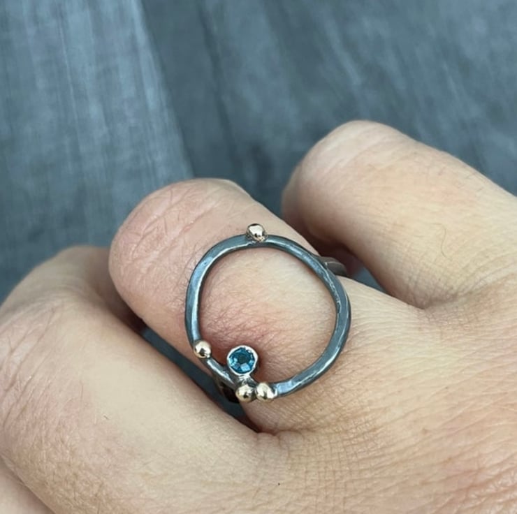 This oxidised and hammered London Blue Topaz Ring statement features a round, faceted, 4mm wide London blue topaz stone. It also features solid 9ct gold ‘bubbles’ detail. The Sterling Silver wire is approximately 2mm wide and the ‘circle’ is approximately 1.3cm in diameter.