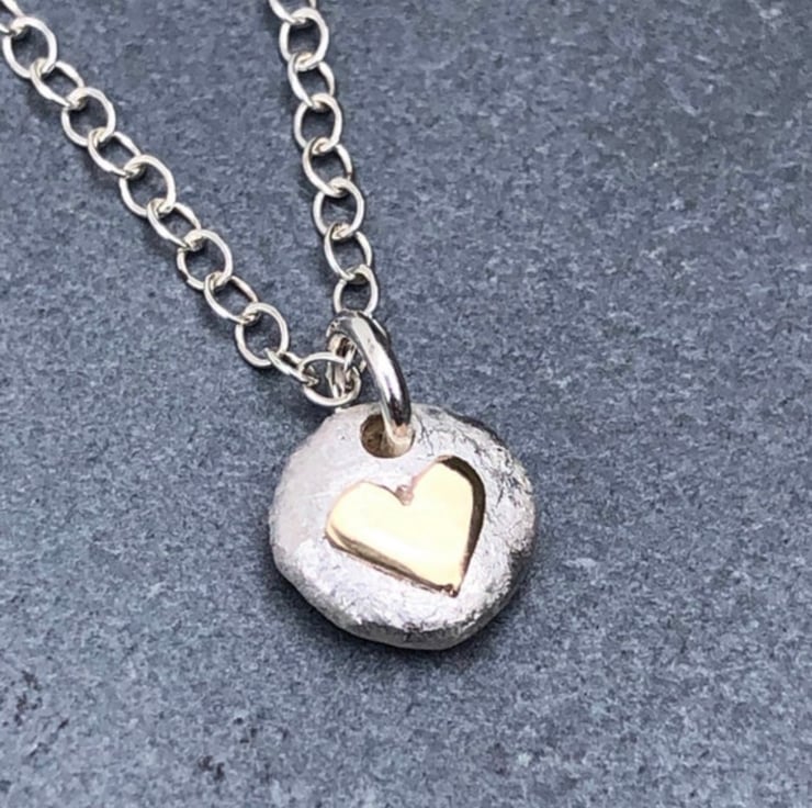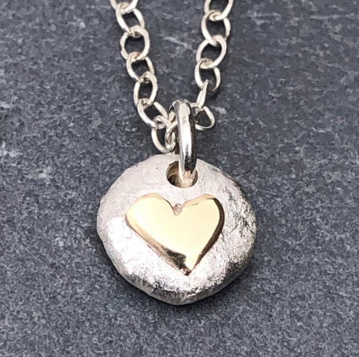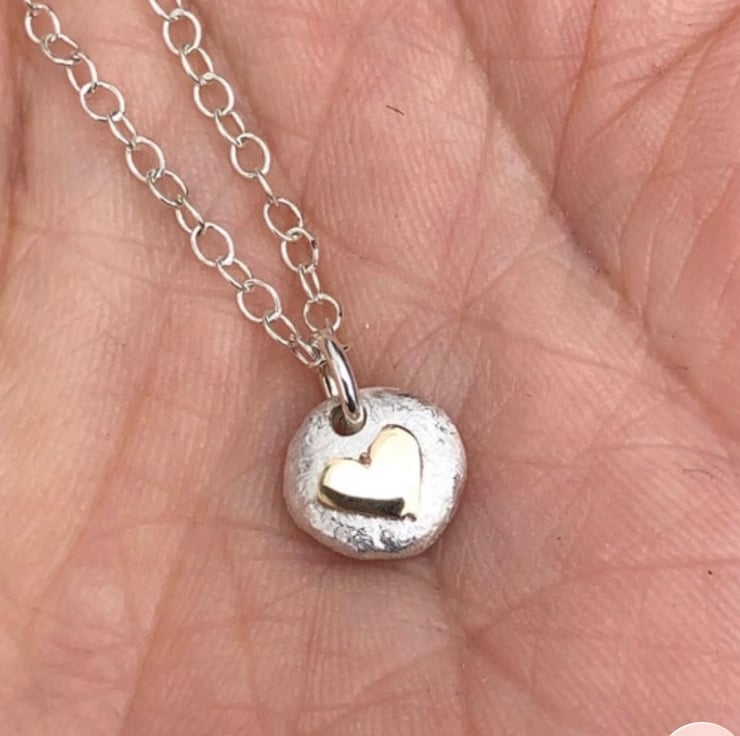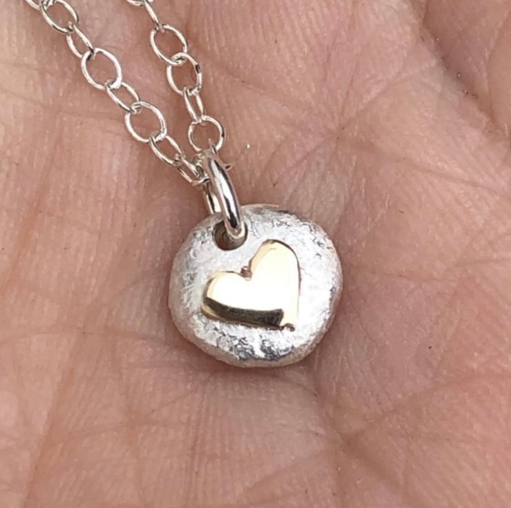 This solid Sterling Silver baby pebble pendant has a 9ct gold heart central detail. The gold is high polished which contrasts beautifully with the frosted matt finished silver.