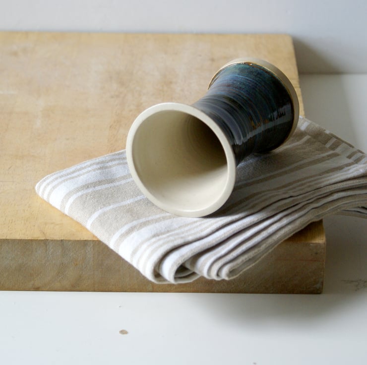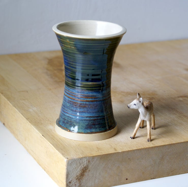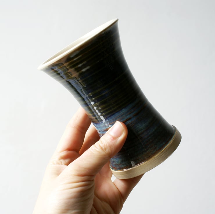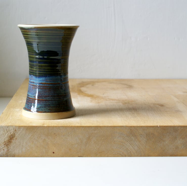 It's been glazed in bands of blue, dark blue and black which have a gloss finish. The inside is glazed simply in transparent.This vase has a flat bottom to sit flush on your kitchen counter and I've hand stamped it with the Little Wren Pottery seal showing its origin as a piece of handmade pottery.