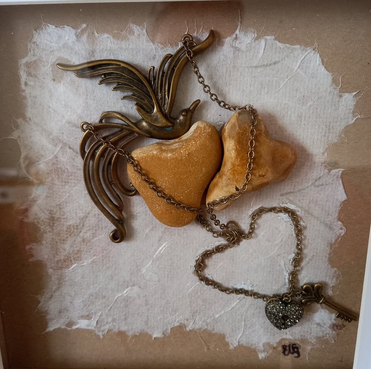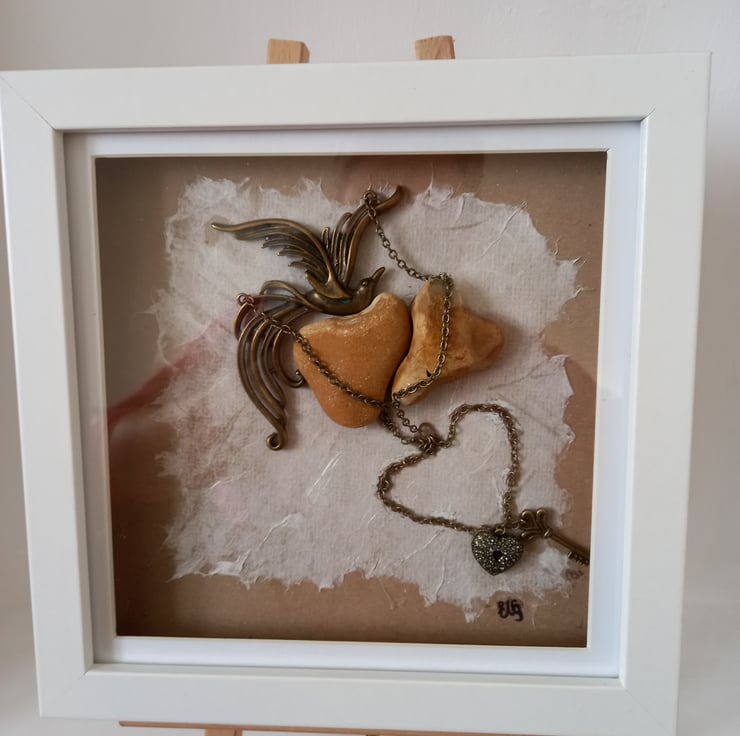 A charming picture made from a heart shaped stone from the beach, surrounded by recycled jewelry, with hand made wild flower paper behind. A wonderful gift for valentines in it's unique appeal.
