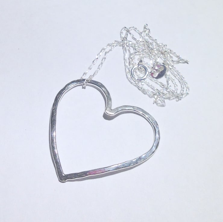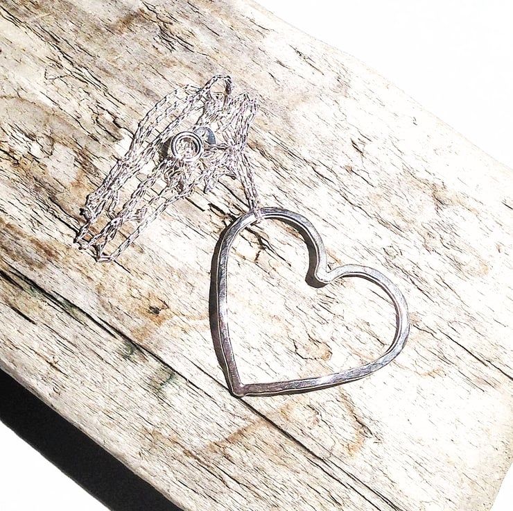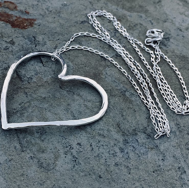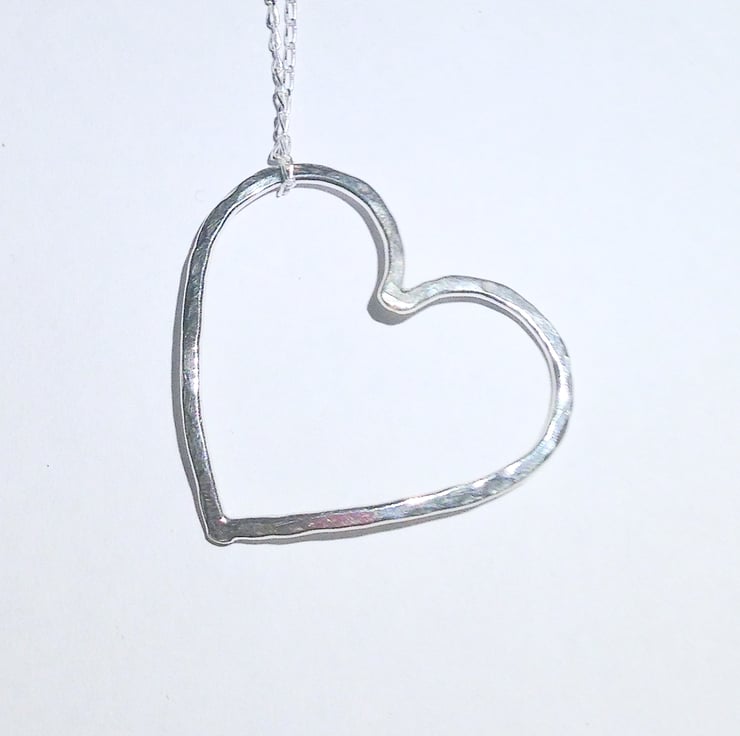 The heart has a hammered finish and is slightly domed to give an attractive effect. It sits at an angle and is free to move around on the chain. It be worn either concave or convex as preferred.