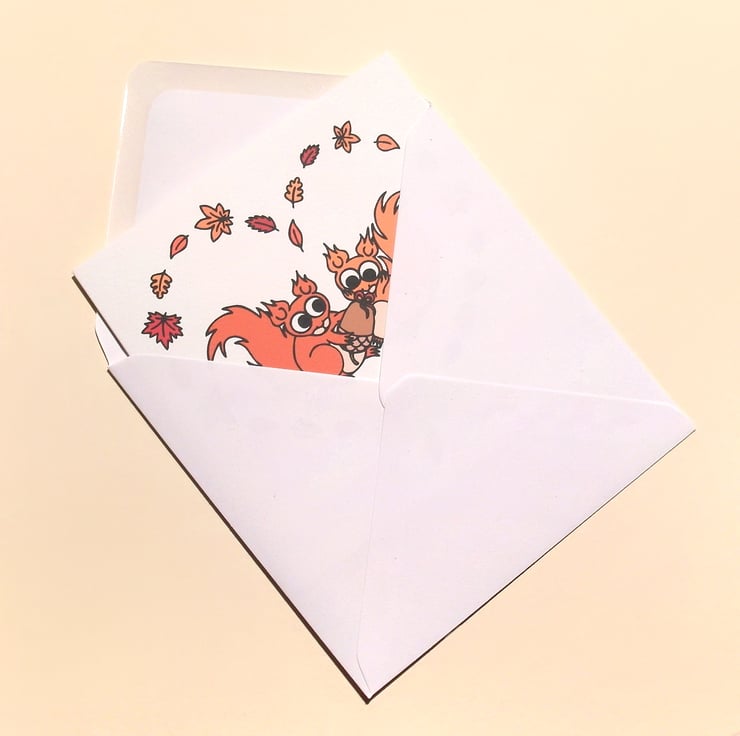 The cartoon squirrel design is printed on a 14cm (5.5") square white card with a 270gsm weight and comes with a white envelope. Both the card and envelope are 100% recycled. The love card will be packaged in a bio-degradable and compostable vegetable starch bag to keep it protected in the post.