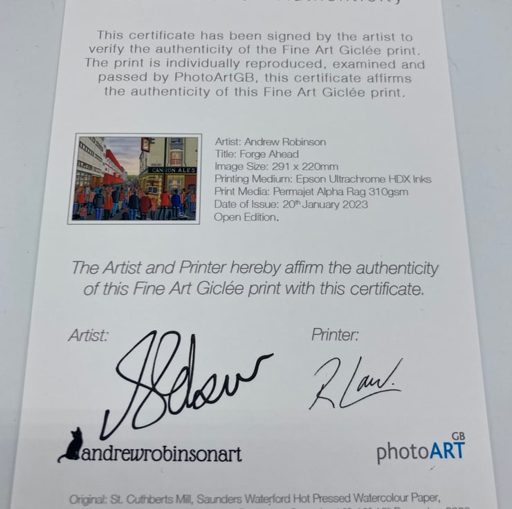 The framed print comes with a 'Certificate of Authenticity' which documents the details of the original painting and the art print. The Certificate of Authenticity is affirmed with a signature from both myself (the artist) and the printer.
