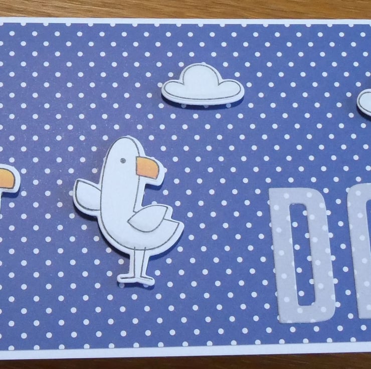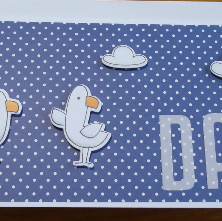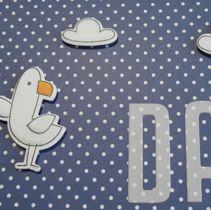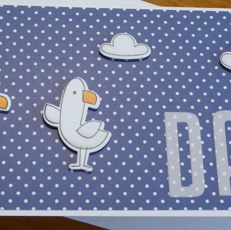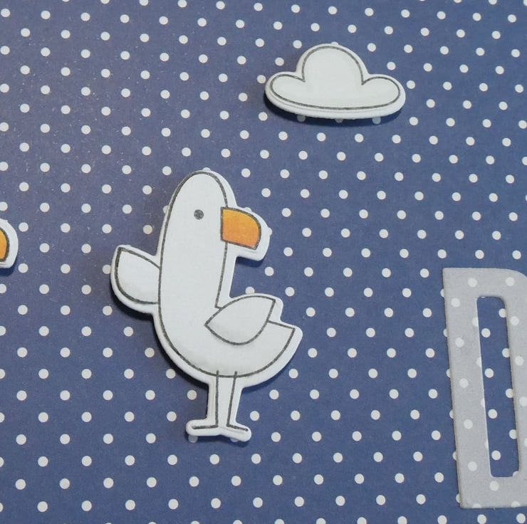 The gulls and clouds have been stamped onto card, coloured and die cut, then mounted using foam pads to lift them from the background. Individual letters forming the word Dad have been cut from pale blue and white polka dot card and glued flat to the background.