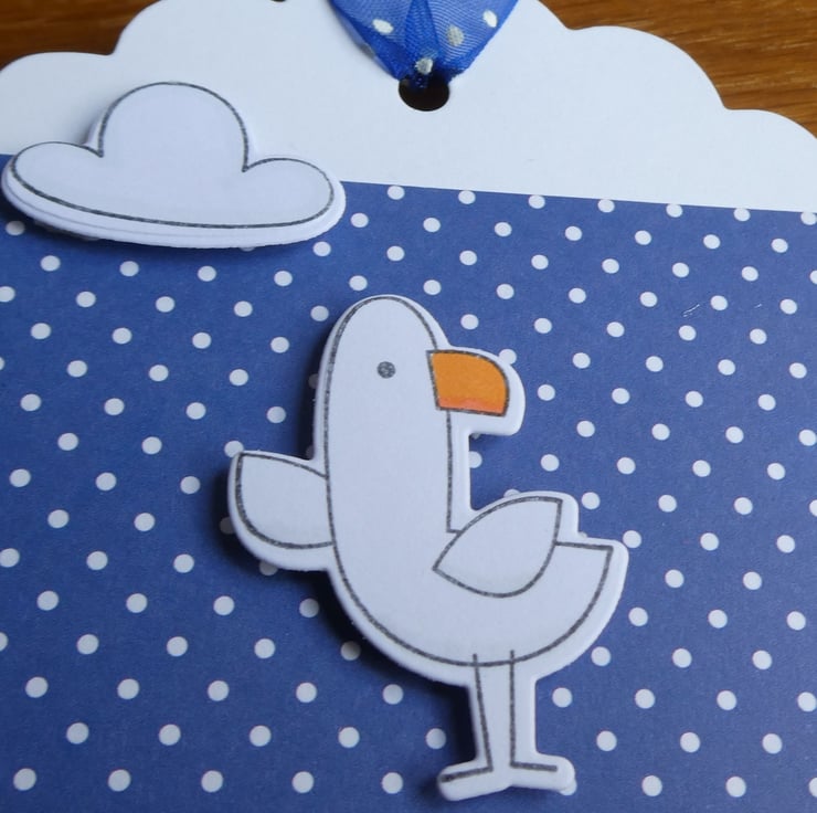 The matching gift tag is rectangular with a scalloped top edge and measures 8 x 12.5cm excluding ribbon. It has hand stamped and coloured images of a matching gull and cloud on a navy and white polka dot band of card with the message 'With Love x' stamped in black archival ink in the bottom corner. It has been finished with a navy and white polka dot ribbon.