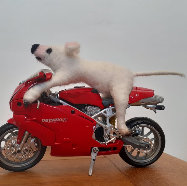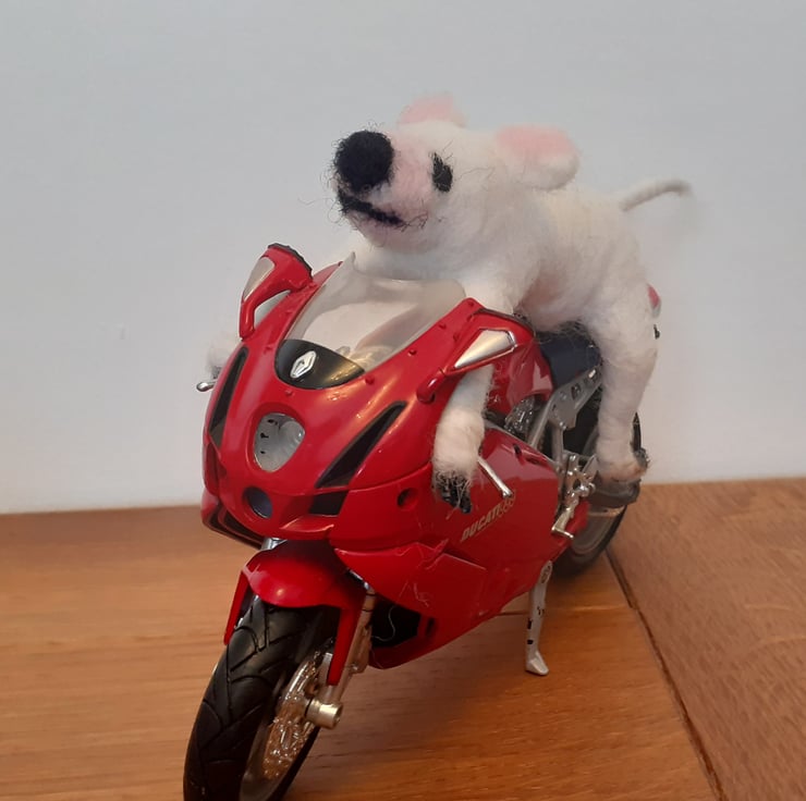 Sitting on a model Ducati motorcycle made of metal and plastic