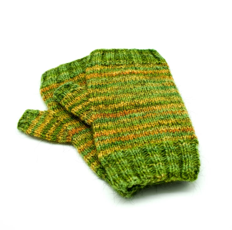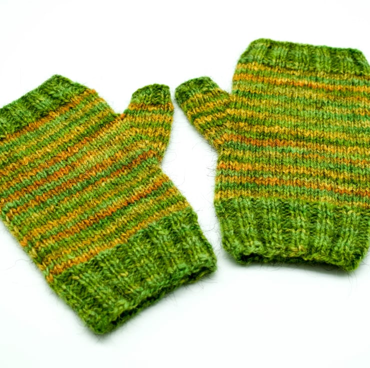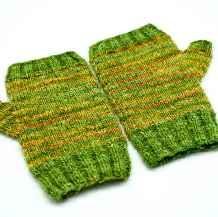These hand knitted fingerless mittens are great for keeping your hands and wrists warm while keeping you fingers free. Made up of green and yellow stripes to form a clean, modern design. I have used hand dyed Isle of Auskerry 100% North Ronaldsay wool which is both soft and robust, ideal for busy hands.