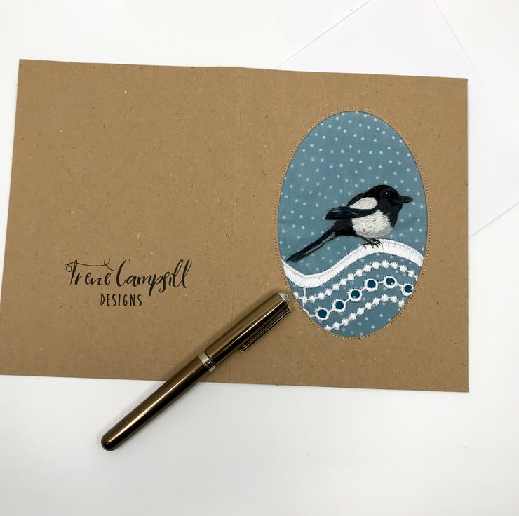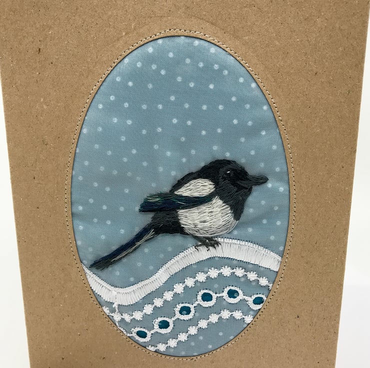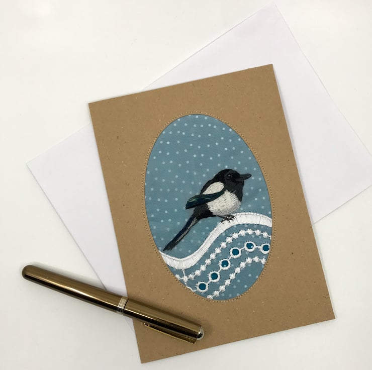 Perfectly Imperfect -Blank greetings card with hand embroidered magpie