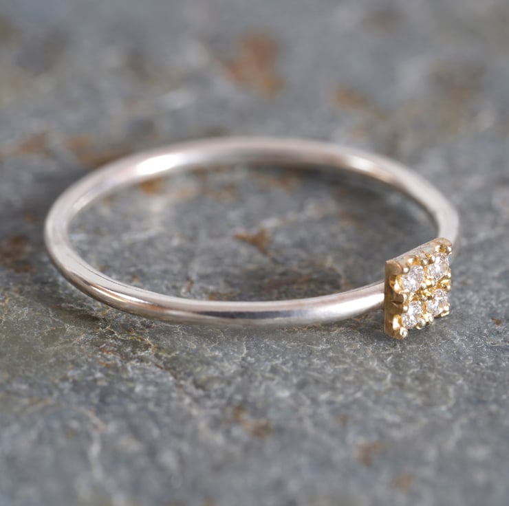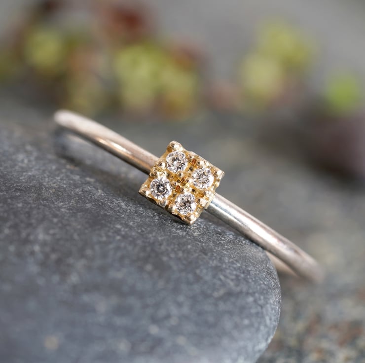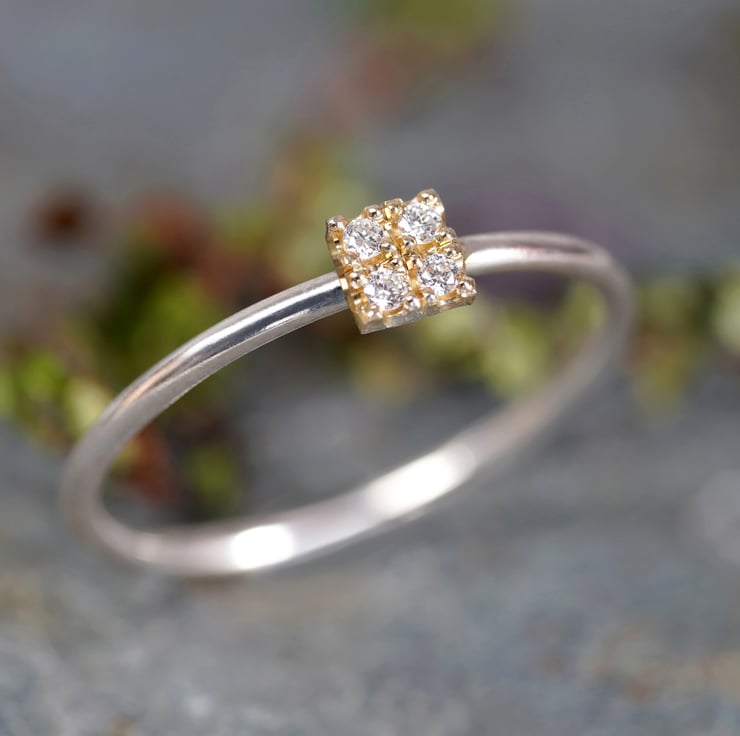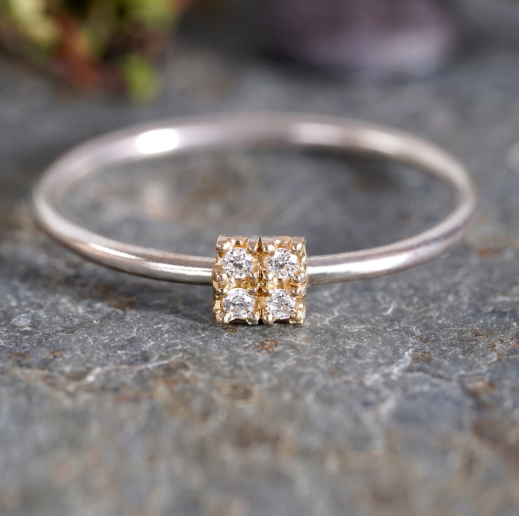 This small pave diamond engagement ring features 4 fine diamonds on the center.