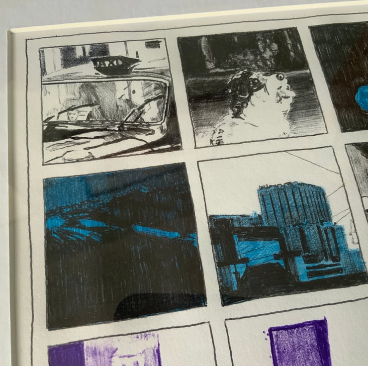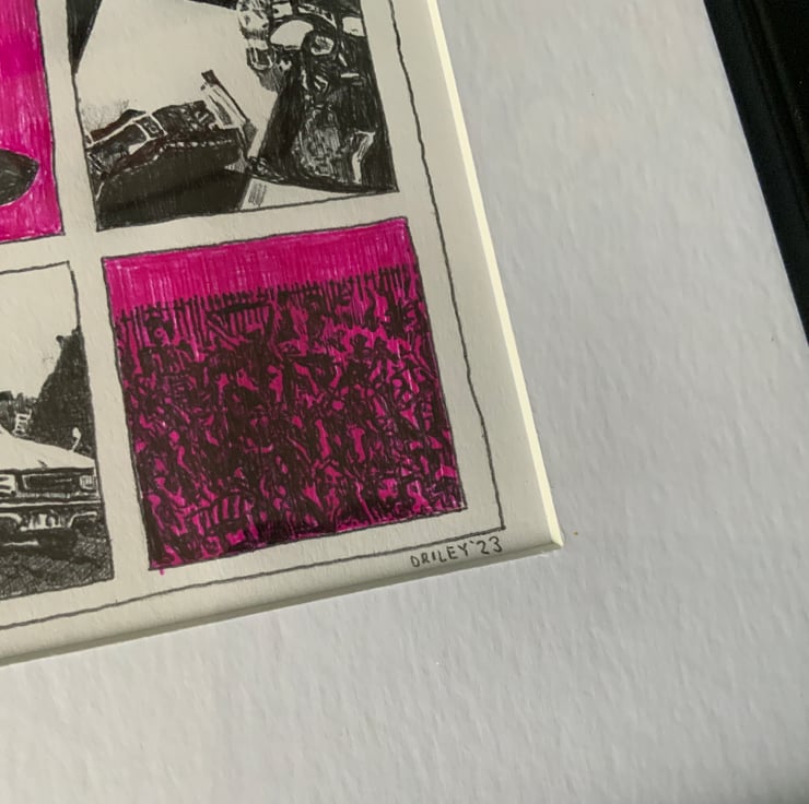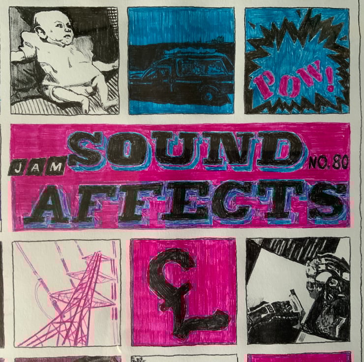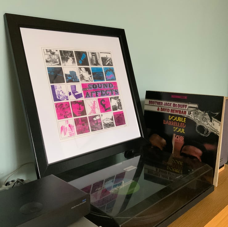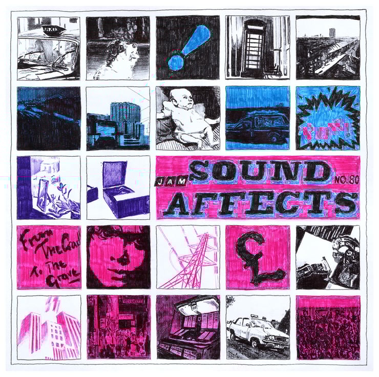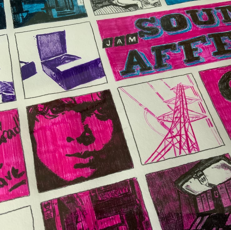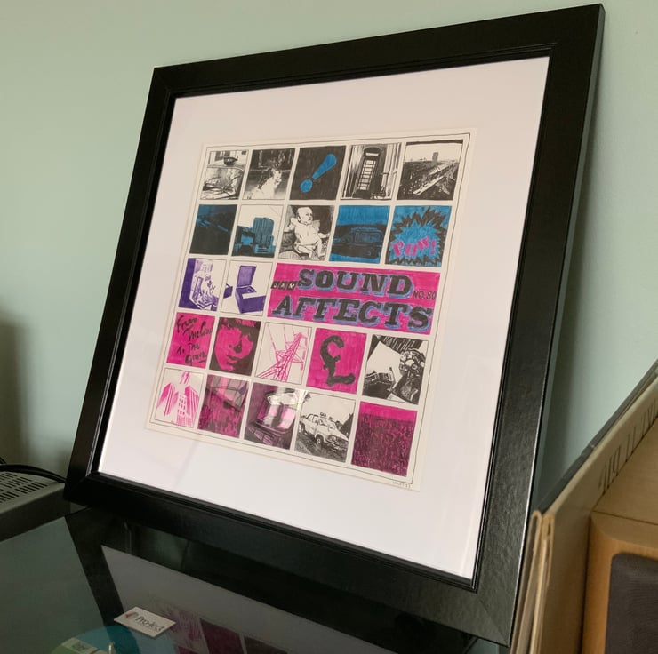 A framed biro drawing of the classic album by The Jam - Sound Affects. This drawing was done entirely with biro pens in just four colours - pink, light blue, purple, and black. The drawing is 28x28cm in dimension and is framed and signed. The frame comes with two eyelets and screws, ready to be attached, but you'll need to supply the string or hanging wire.