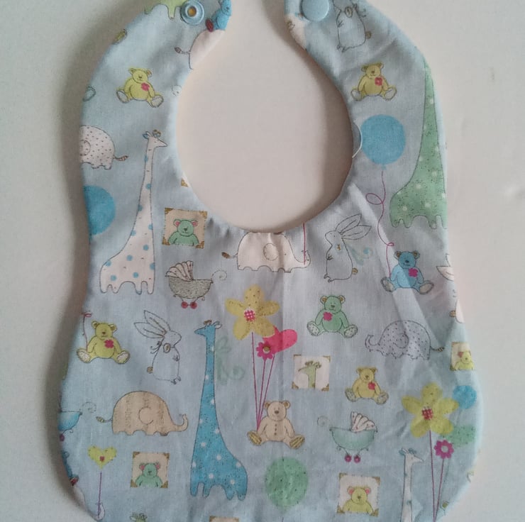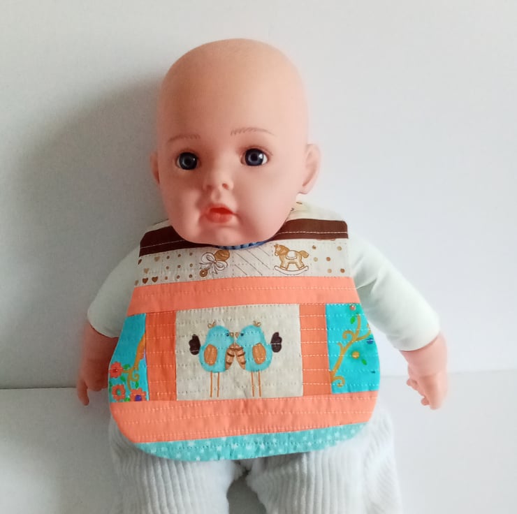 A small bib suitable for 0-3 months with a popper fastening. Reversible with quilted patchwork one side featuring two cute birds with a blue nursery design on the other side with a cotton batting centre.