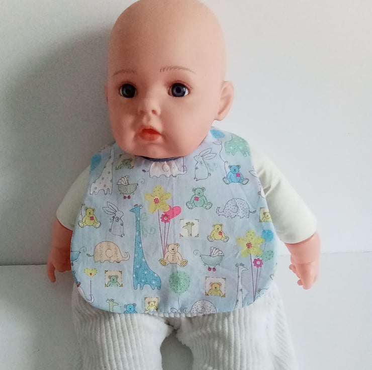 A small bib suitable for 0-3 months with a popper fastening. Reversible with quilted patchwork one side featuring two cute birds with a blue nursery design on the other side with a cotton batting centre.
