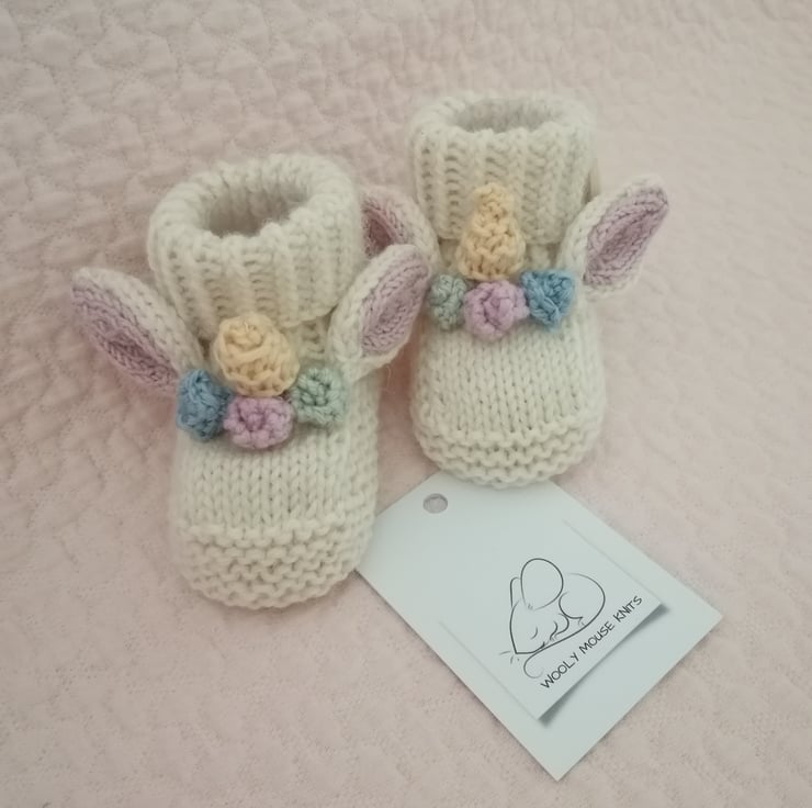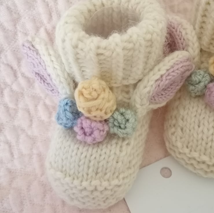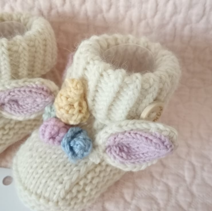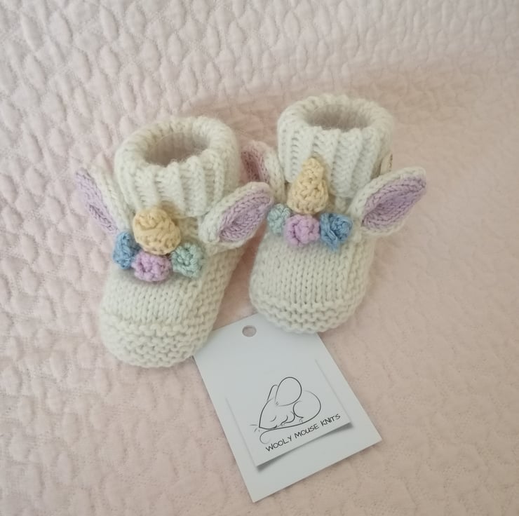 Hand knitted in cream unicorn design baby bootie. Each unicorn will be different but will follow the same concept and design making them unique. Newborn in size and knitted in 65% merino 35% alpaca that needs to be hand washed. Wooden button added to each folded over leg cuff that says hand made. Would make an ideal gift for any new arrival.
