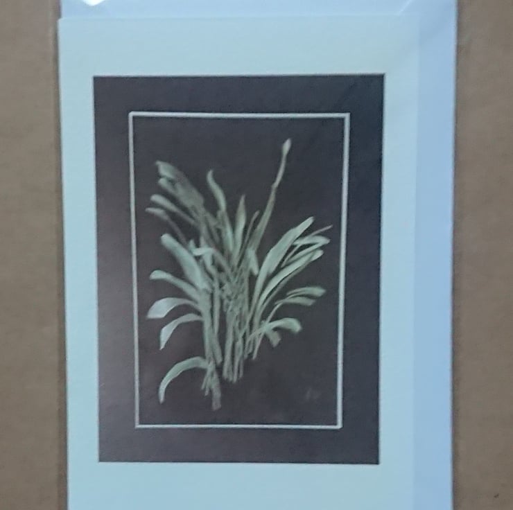 The colours have printed out a bit light on this houseplant card so it is reduced in price as a seconds. There is only one imperfect card in stock, but the second photo is of the original artwork which shows the richer colours. The original is colour pencil on black fine art paper. It is for sale but not yet listed on Folksy. The preliminary sketch was made at the same "Blind Drawing" session in 2020 (not looking at the paper just the plant while drawing it) as when I drew one for Cactus on Black of which the card is listed in my shop. So the leaves are not like pointy Areca leaves and some are not on the plant, but that is the beauty of "blind drawings". Message me if you are interested in the original framed art.