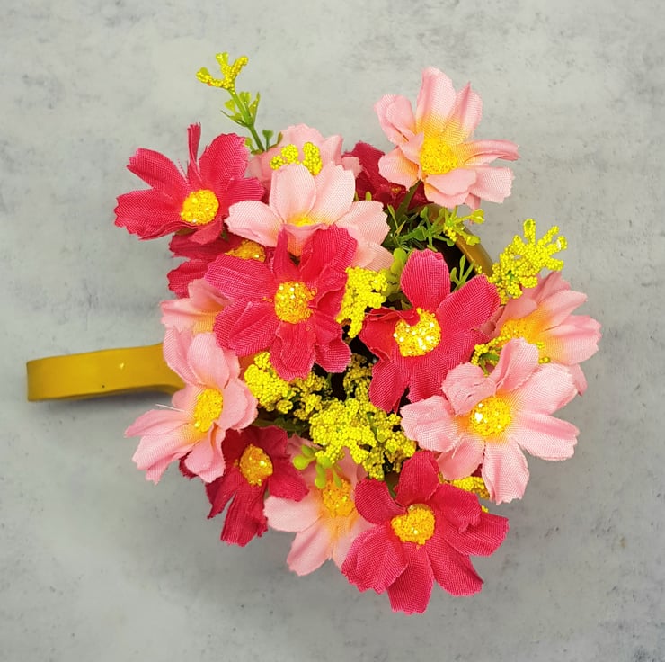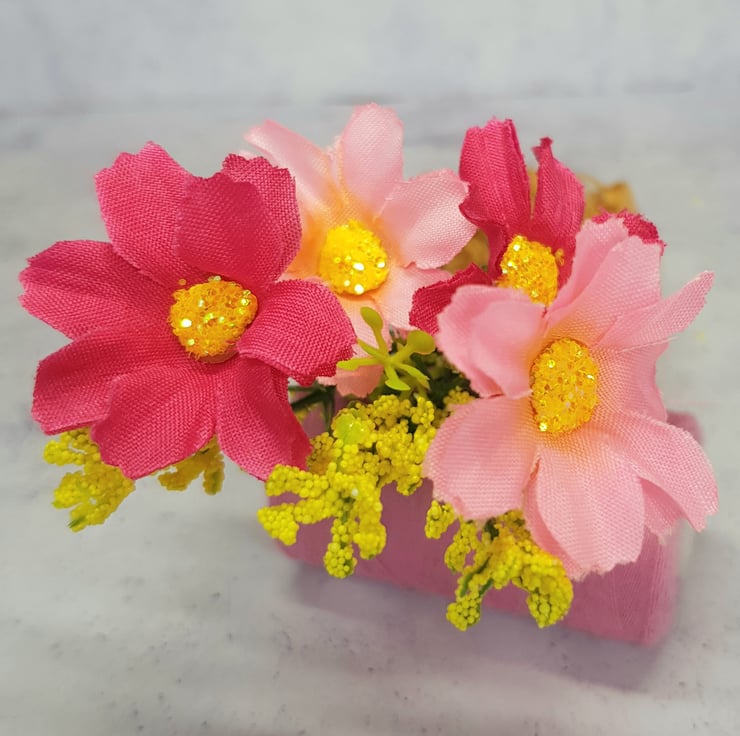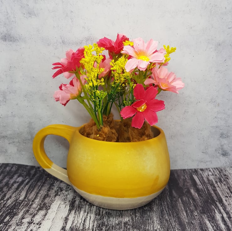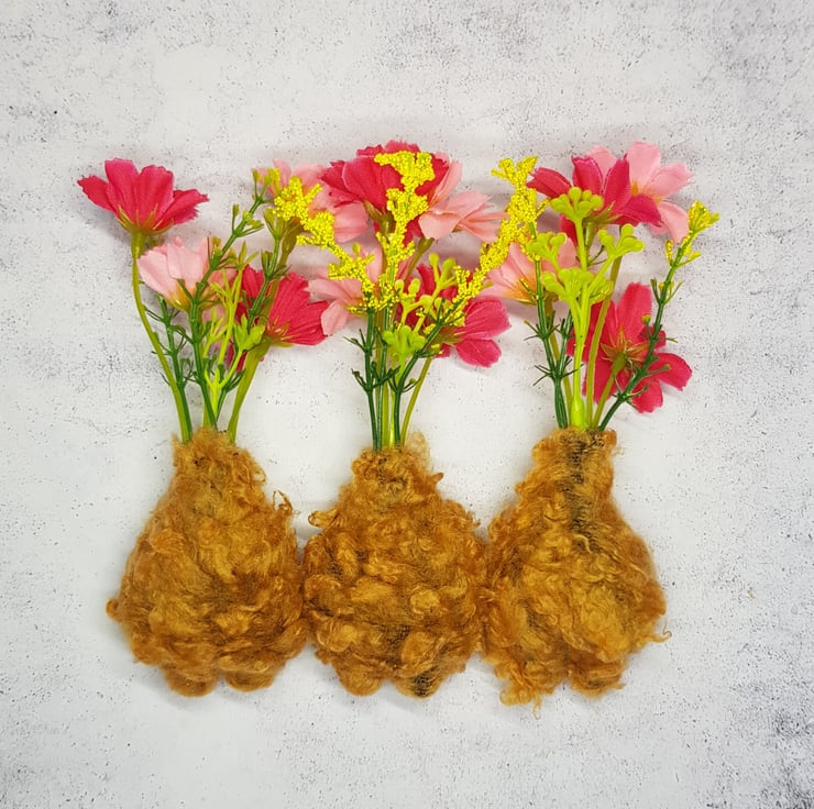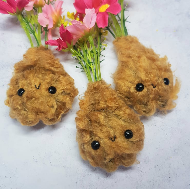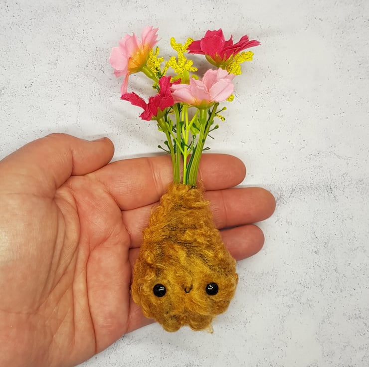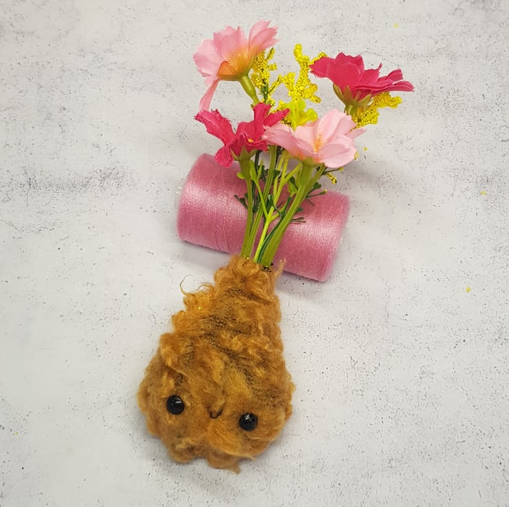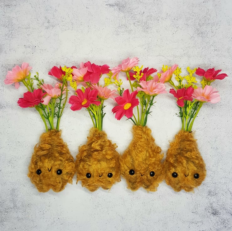 This little mandrake has curly faux fur with glass eyes and hand stitched smile. From it blooms a small posy of faux daisies with glitter centres. This listing is for one mandrake only. Mandrakes measure roughly 14cm tall including flowers. This is for decorative purposes only and not a toy. Sent in recyclable packaging.
