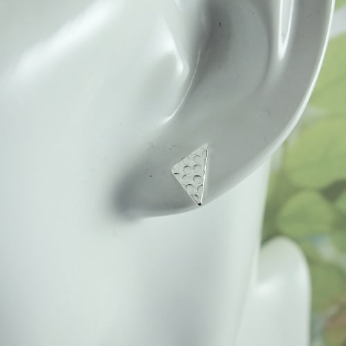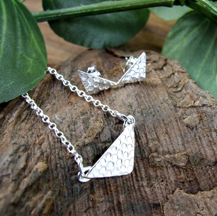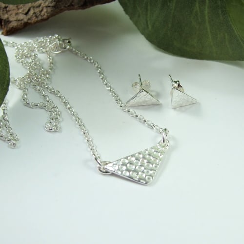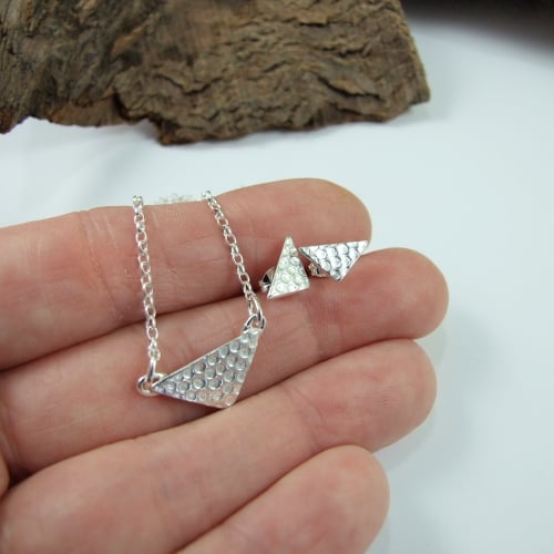 I have created the triangles from silver sheet that I have textured and hand cut into three triangles to create the set. I have soldered on two small rings to fit an 18 inch chain to for the earrings and .925 sterling silver posts to the two smaller triangles for the earrings.