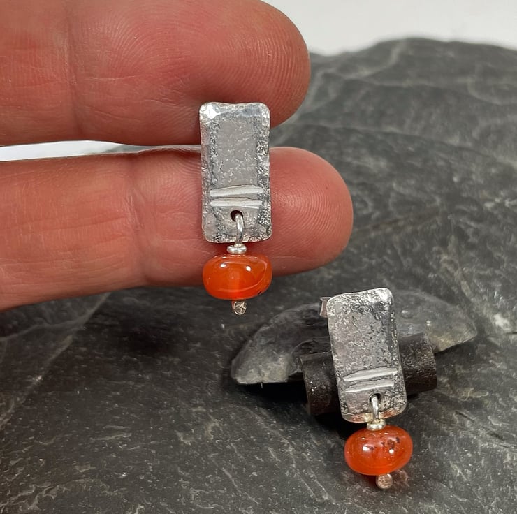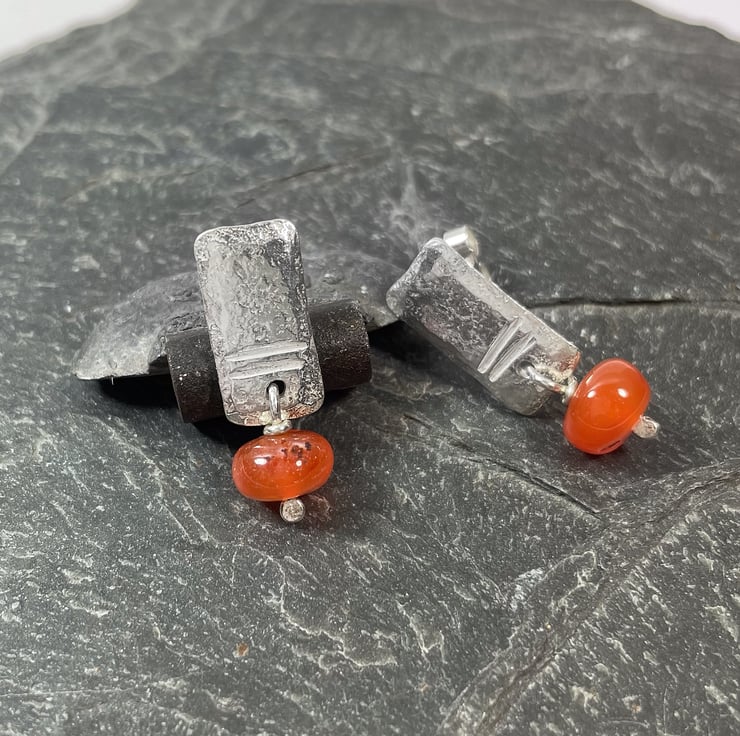 These earrings have a rectangular top cut from thick silver and a juicy orange carnelian bead dangle below.