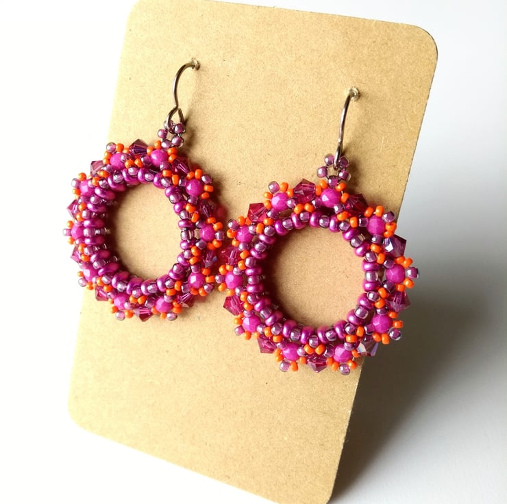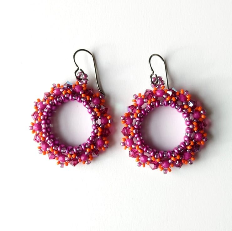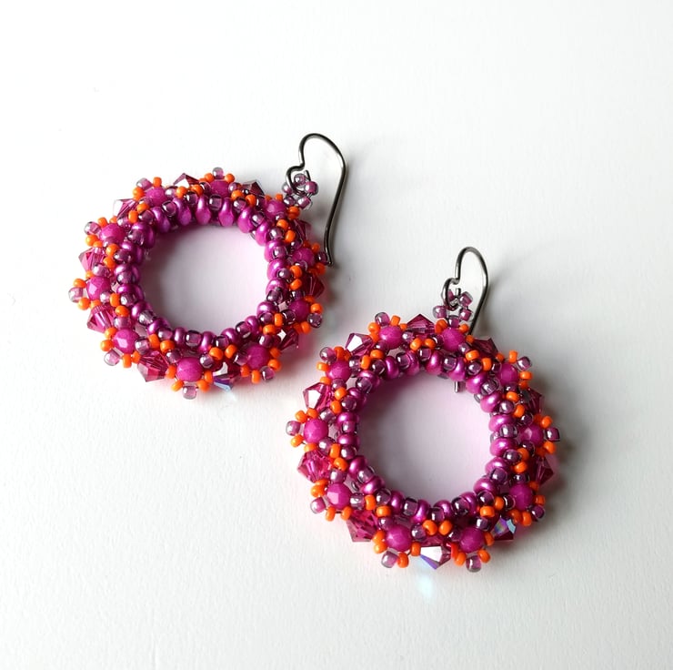 Twin-holed beads have been used to form a solid ring and then embellished with crystals and seed beads. This pair features sparkly Preciosa 4 mm crystal bicones in fuschia - plus faceted 3 mm bright magenta pink-coloured glass beads, together with seed beads in magenta and orange.