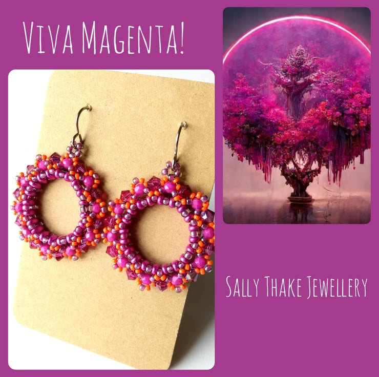 Beautiful crystal and glass seed bead earrings hand-woven with just a needle and thread. This vibrant pair has been inspired by Pantone's colour of the year for 2023, Viva Magenta - I hope you like them!