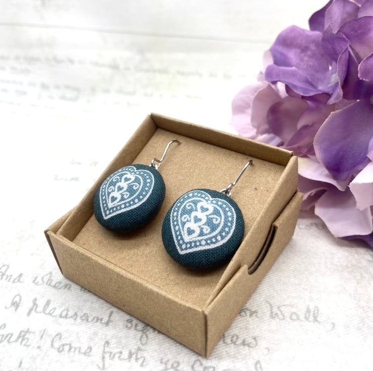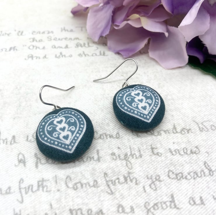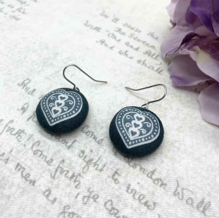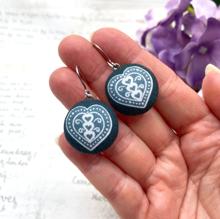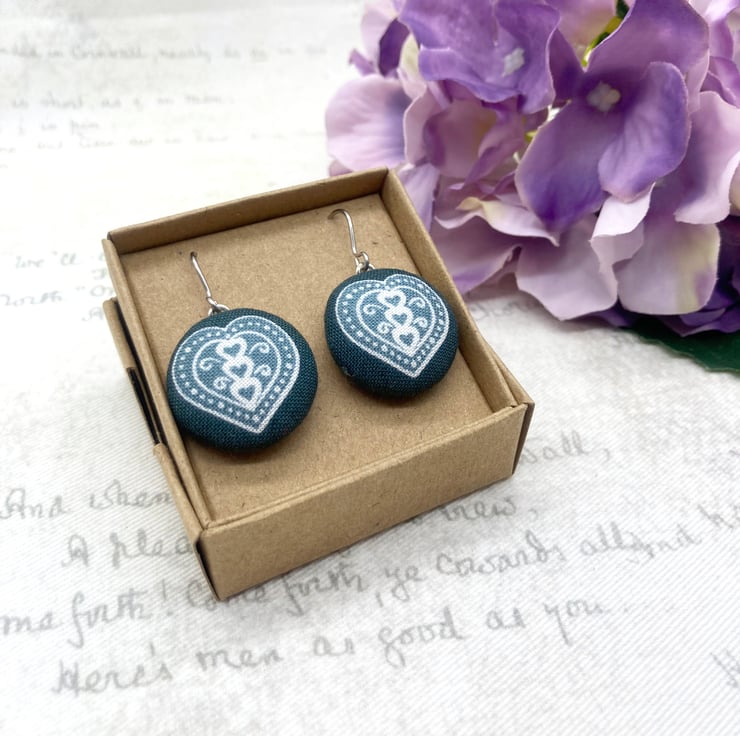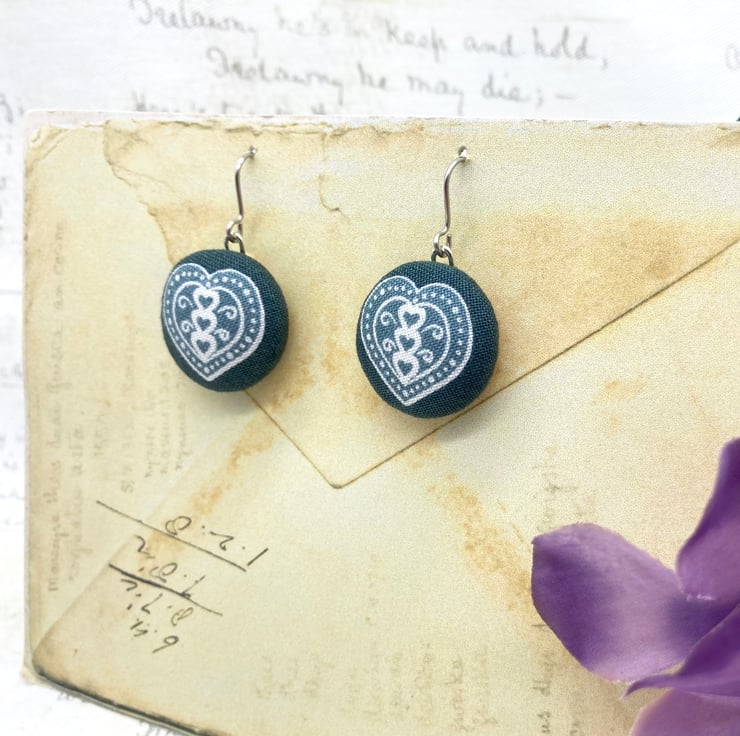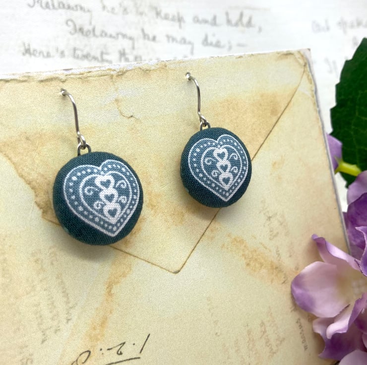 Perfectly Imperfect - Scandi love Hearts fabric button dangle earrings