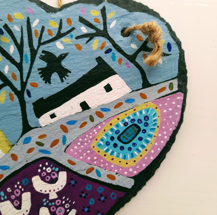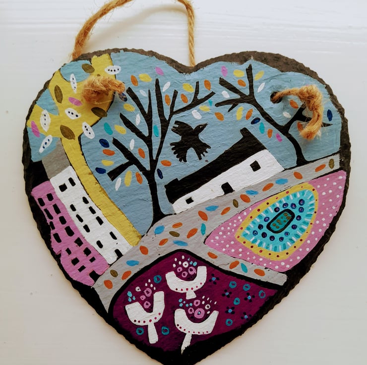 This slate heart is hand painted and ready to hang in a small space . It measures approx 6 x 6 inch at its widest points, and has been varnished for protection.