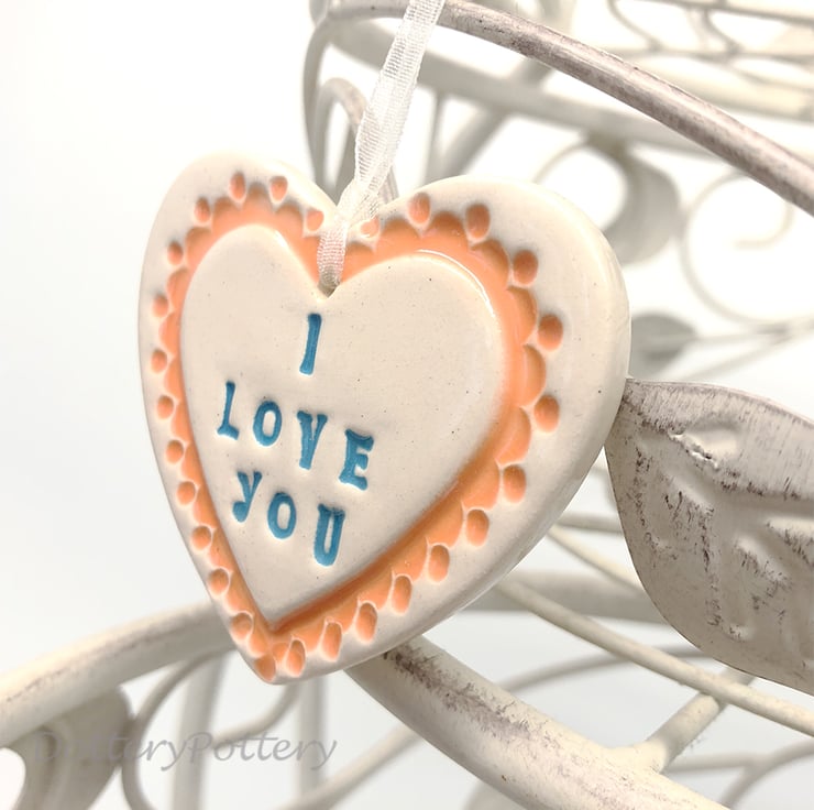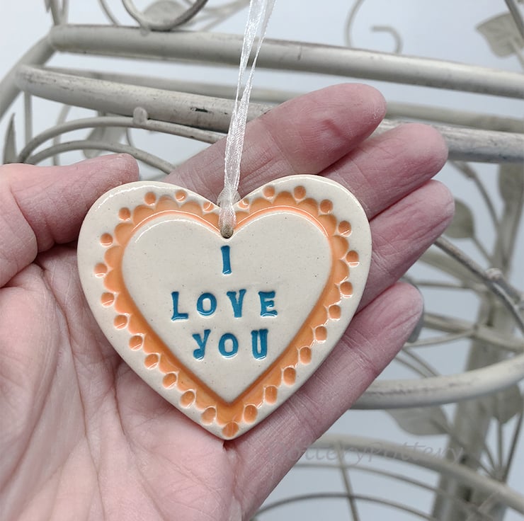 This little heart is made from white earthenware clay and imprinted with the words I Love You. It has been fired twice, once to the bisque stage and then a second firing for the clear glaze. it is a cream based clay with a retro orange and blue design. It measures 6.5 centimetres wide x 5.5cm height x 5mm thick.