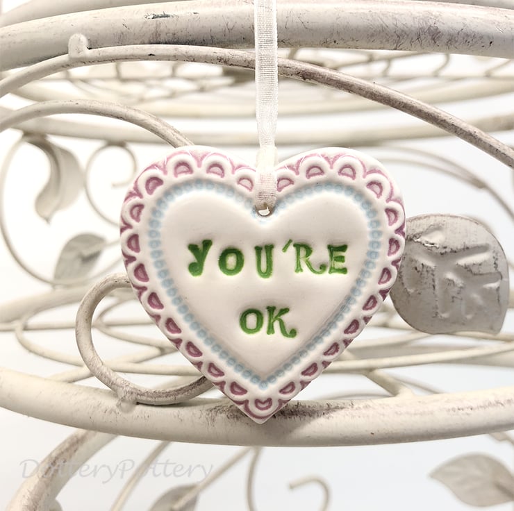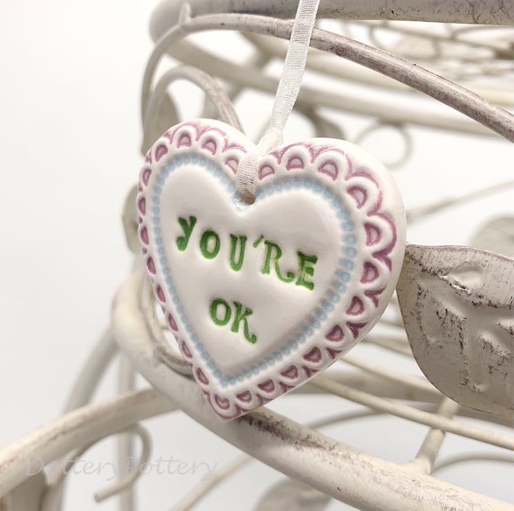 This little heart is made from white earthenware clay, imprinted with the words You're OK. If this is as sentimental as you get - show someone you really care!. It has been fired twice, once to the bisque stage and then a second firing for the clear glaze. It measures 4.5 centimetres wide x 5cm height x 5mm thick. It can be hung outside.