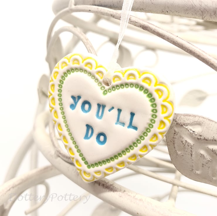 This little heart is made from white earthenware clay, imprinted with the words You'll Do. If this is as sentimental as you get - show someone you really care!. It has been fired twice, once to the bisque stage and then a second firing for the clear glaze. It measures 4.5 centimetres wide x 5cm height x 5mm thick. It can be hung outside.