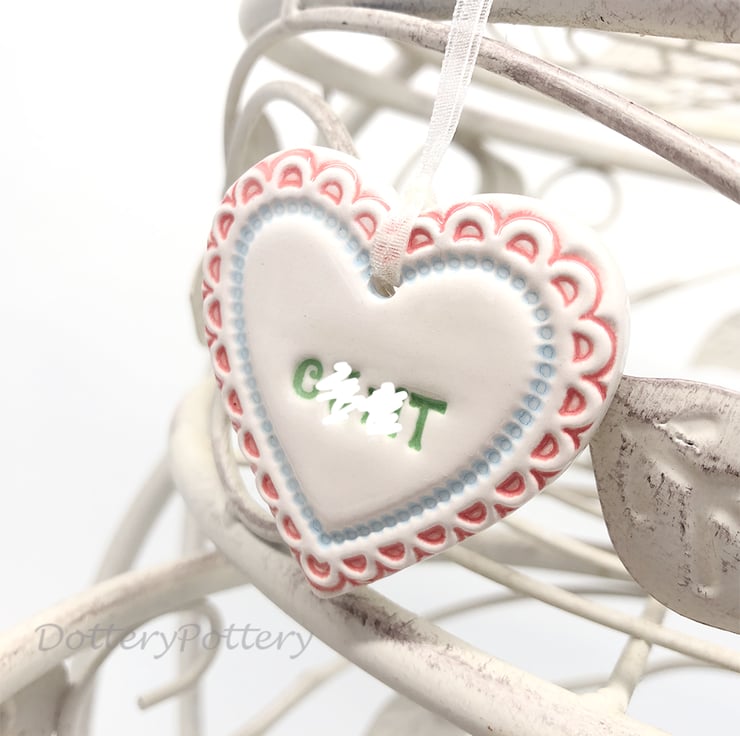 This little heart is made from white earthenware clay, imprinted with the words CUNT. The perfect gift to let someone know how much you love them! Some of the letters may be a bit higgledy piggledy but they have been stamped with love! It has been fired twice, once to the bisque stage and then a second firing for the clear glaze. It measures 4.5 centimetres wide x 5cm height x 5mm thick. It can be hung outside.