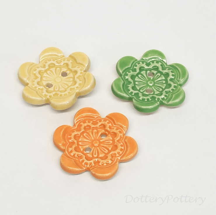 This set of three flower shaped pottery buttons are made from white earthenware clay, embossed and glazed on the front. They are then fired to 1100 degrees, so nice and strong. They measure 2.8cm. They can be handwashed or machine washed on a low temperature. Perfect for all sorts of arts and craft projects