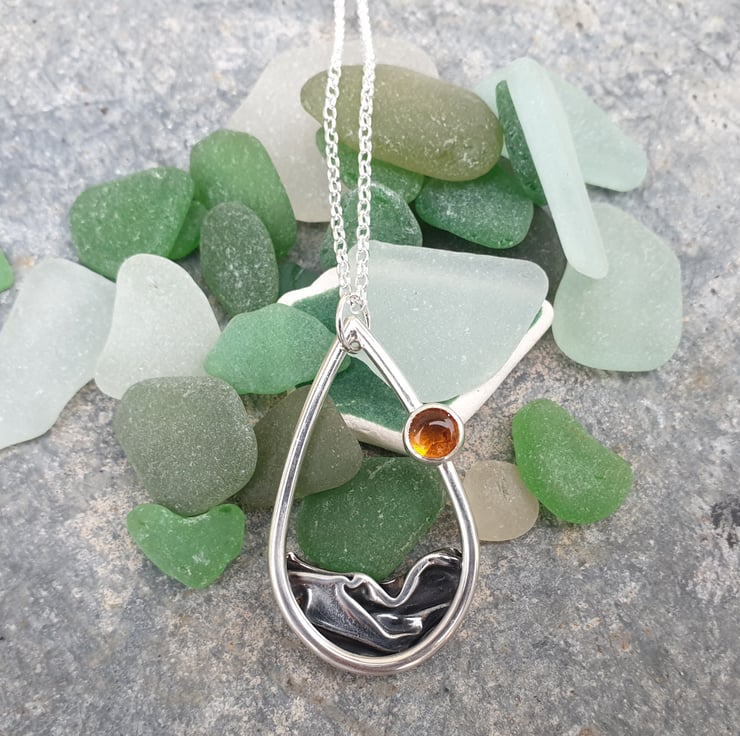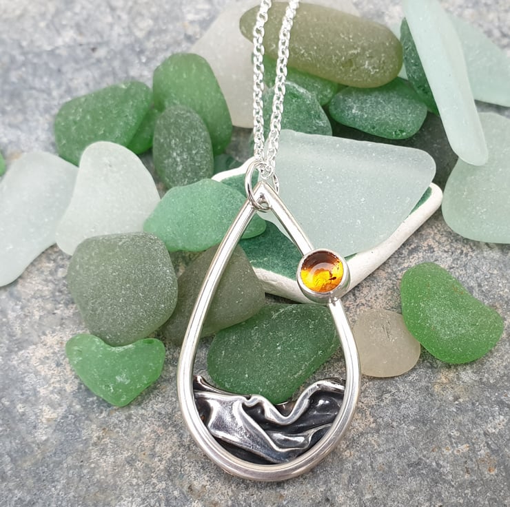 This pendant is perfect for anyone who loves the great outdoors, wild swimming, kayaking or just enjoys beach walks. The sterling silver teardrop is formed from 2mm round wire and has a layer of fine silver which has been folded to create the wave like texture. A 6mm amber cabochon set in silver has been added to depict the sun. Measuring approx 38mm long and 24mm across and hangs from a sterling silver belcher chain which fastens with a bolt clasp.