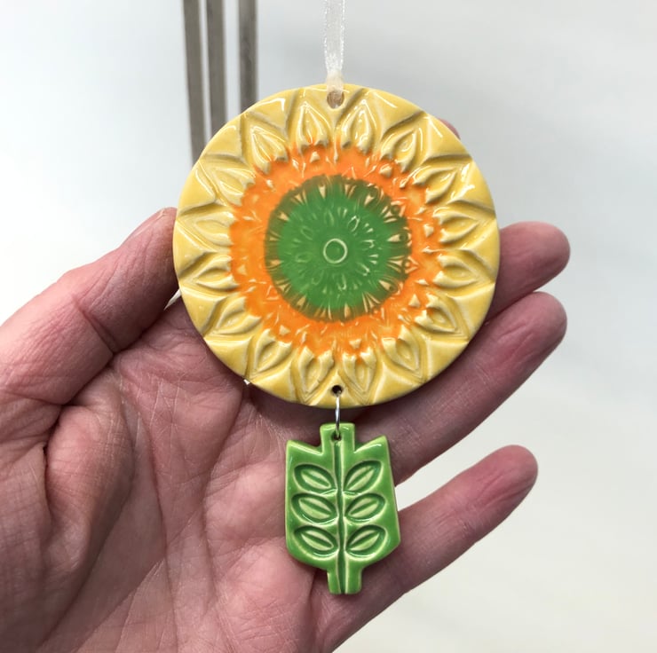 This flower deoration is made from white earthenware clay, imprinted with pattern and finished with a bright, glossy glaze. It has been fired twice, once to the bisque stage and then a second firing for the glaze. It measures 10 centimetres high x 5.5cm wide x 5mm thick.